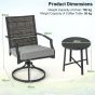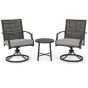 Featuring a swiveling function, this 3-piece patio swivel set enhances your outdoor leisure time by providing a superior relaxing experience. The chair boasts an ergonomic seat with curved armrests and a high backrest, ensuring maximum comfort. It encompasses various considerate details, like adjustable footpads and a stable swiveling base, perfecting the rocking chair. Additionally, the coffee table is not only compact but also practical, conveniently placing all your necessities within easy reach. Furthermore, the thick PE rattan of backrest exudes elegance while also offering remarkable durability. 360° Swiveling Chairs: The 2 chairs can be 360° swiveled as you need. The smooth and sturdy swiveling motion makes you more relaxed, and offers more convenience for you to interact with others at the same time. And the sitting area is made of breathable and quick-drying fabric. Sit with Comfort: The ergonomic backrest and curved armrests will make your whole body relaxed. And the 5" thickened comfy seat cushion with high-density and elastic filling allows you to enjoy optimal comfort during relaxation. Plus, the smooth zipper makes maintenance easier, and the fixing buckle keeps the cushion always in place. Premium Rattan Design: The backrest of the chair is made of top-grade mix gray PE rattan which withstands long-time outdoor use. The rattan used in these 2 swiveling chairs is not only well-woven, anti-fading and elegant, but also much thicker than other rattan chairs. Super Sturdy Metal Frame: The main frame of both the table and chairs are constructed of premium metal which is rustproof and sturdy. And the X-shaped metal frame of table highly improves the stability. Furthermore, the adjustable footpads of swiveling chairs make them stand more stably. Wide Range of Application: This 3 piece patio swiveling set comes with a functional coffee table, so you can easily fetch drinks and snacks. The patio set is both practical and appealing, suiting well for different occasions, such as backyard, poolside, and so on. Dimension of chair: 26.5" x 24" x 35.5" (L x W x H). Dimension of coffee table: 17.5" x 18" (Dia x H).