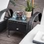 The rattan patio chaise lounge set from comes complete with 2 loungers, 1 side table and cushions. The seat has 5 adjustable positions to give maximum relaxation and comfort. The side table also has a glass top to keep your drinks at easy reach, and the set can be used indoors and outdoors.