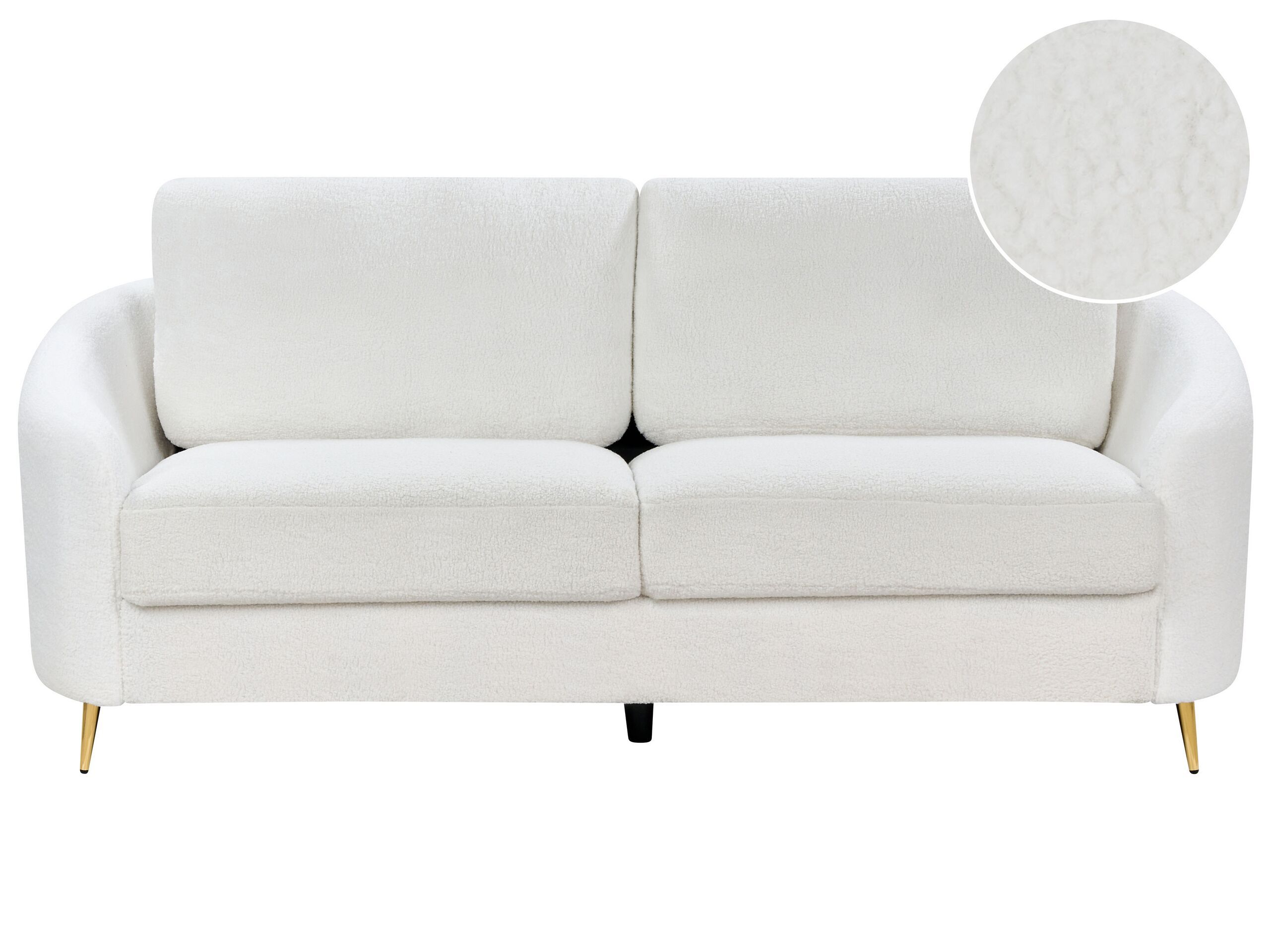Make yourself comfortable on this unique sofa with a curvy shape, which can accommodate up to 3 people. The thickly padded seat and backrest cushions guarantee high comfort of use. Golden metal legs emphasize the unique colour of the upholstery and add elegance to the whole design. This furniture will certainly create a cosy atmosphere in your interior which boosts relaxation. Details: Color: White, Gold. Main material: Boucle. Additional material: Plywood, Metal. Material Composition: 100% Polyester Weight: 43 Capacity: 3 People Assembly: Full Assembly Required Cushions Dimensions: 85x45 Legs Height: 13 Padding Thickness: 18 Seat Height: 48.5