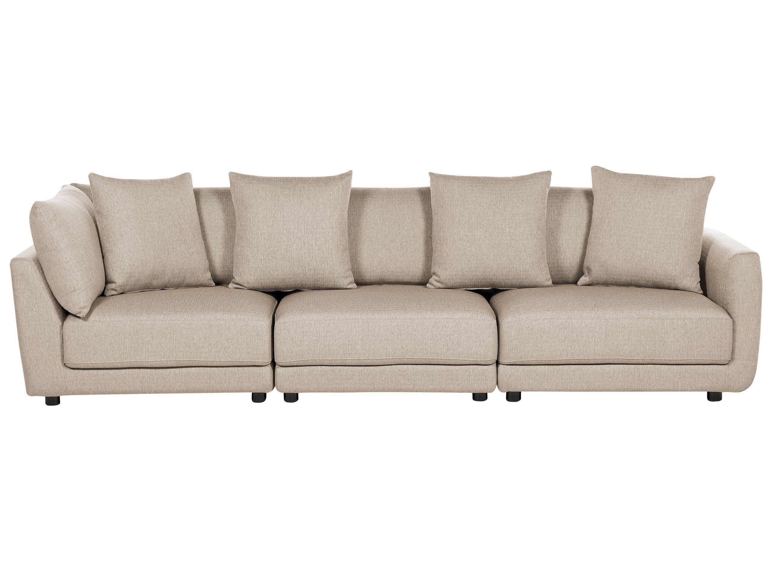 Crafted out of high-quality polyester fabric, this upholstered couch will be a perfect addition to your living space. Its classic, enduring design ensures seamless integration with a diverse range of interior styles, from vintage to modern. The couch comes with a set of throw cushions, which will make the sofa even more comfortable. The sofa features plush seating, a relaxed back cushion arrangement, and is finished in a sophisticated light grey shade that distinguishes it from other pieces in the room. Details: Color: Beige, Black. Main material: Polyester. Additional material: Synthetic Material, Eucalyptus Wood. Material Composition: 100% Polyester Weight: 123 Capacity: 3 People Assembly: Full Assembly Required Wood type: Eucalyptus deglupta Wood Origin: China Cushions Dimensions: 47x47 Legs Height: 5 Padding Thickness: 28 Seat Height: 43
