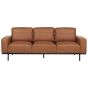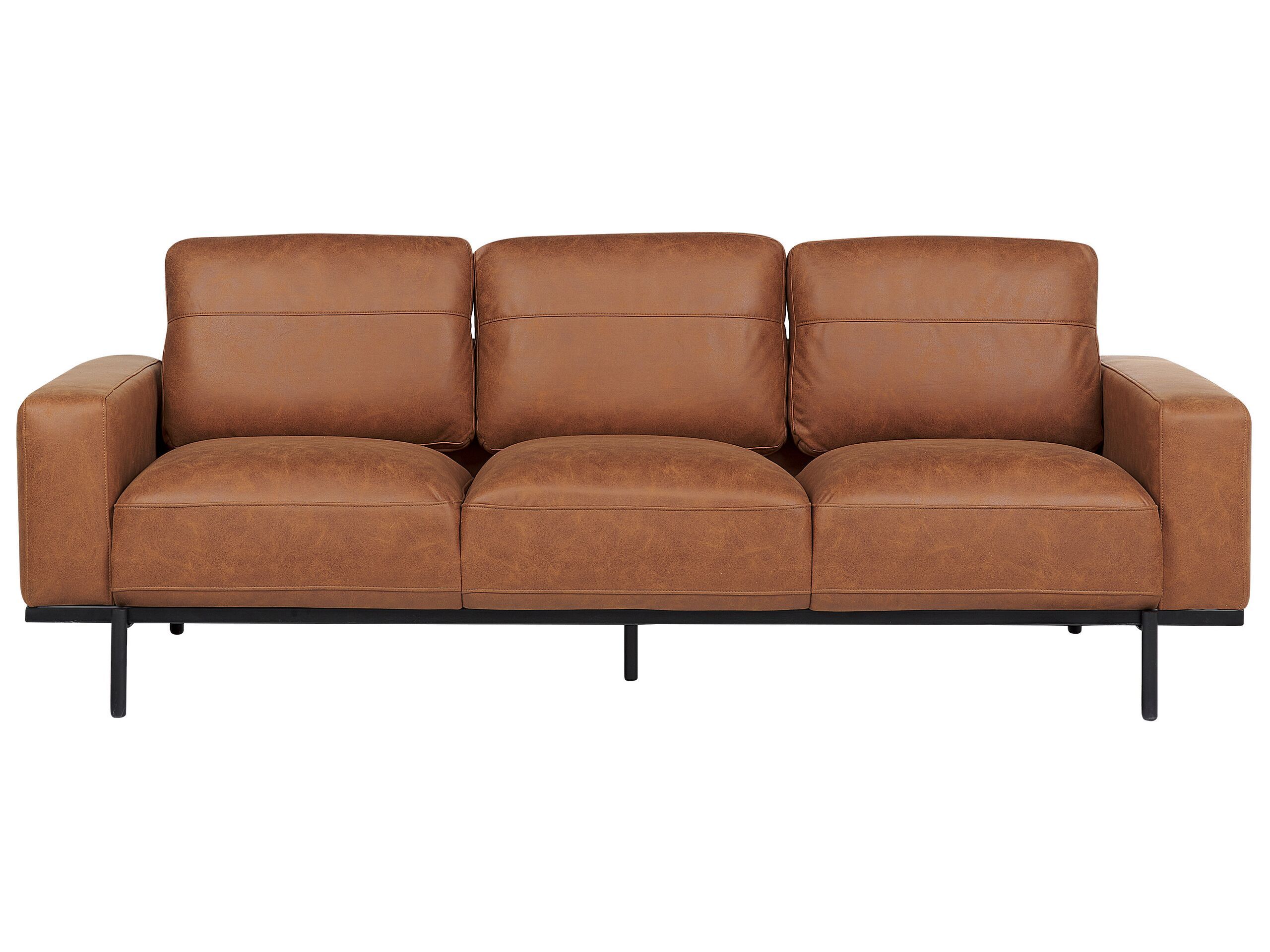Indulge in the epitome of contemporary comfort with this three-seater sofa—a sleek fusion of sophistication and relaxation. Crafted with supple high-quality polyester that perfectly replicates faux leather upholstery. It texudes a luxurious feel, this stylish seating masterpiece effortlessly elevates any space. The minimalist allure extends to its sturdy metal legs, adding an urban edge that captivates the eye. Unwind in style on this modern marvel—where fashion meets function, and every moment is a plush embrace. Details: Color: Brown. Main material: Polyester. Additional material: Metal, Eucalyptus Wood, Plywood. Material Composition: 100% Polyester Weight: 42 Capacity: 3 People Assembly: Full Assembly Required Wood type: Eucalyptus grandis Wood Origin: China Cushions Dimensions: 60x40x15 Legs Height: 15 Padding Thickness: 27 Seat Height: 40