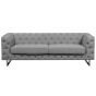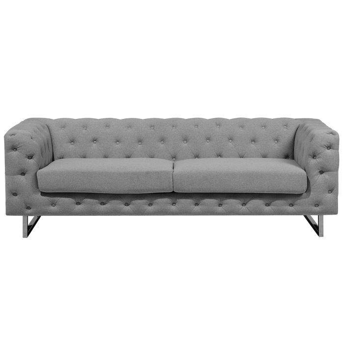 Give your living space a makeover and introduce a glam feel with this upholstered three-seater. Its chic design influenced by Chesterfield form combined with a tuxedo sofa style fits any modern as well as traditional home décor. Tailored in high-quality grey fabric, the sofa comes with stainless steel legs, thick seat cushions for high sitting comfort and accent button-tufting on the outline. Details: Color: Grey, Silver. Main material: Polyester. Additional material: Stainless Steel, Eucalyptus Wood. Material Composition: 100% Polyester Weight: 46 Capacity: 3 People Assembly: Legs to be Fitted Wood type: Eucalyptus deglupta Wood Origin: China Legs Height: 15 Padding Thickness: 16 Seat Height: 46