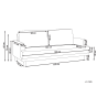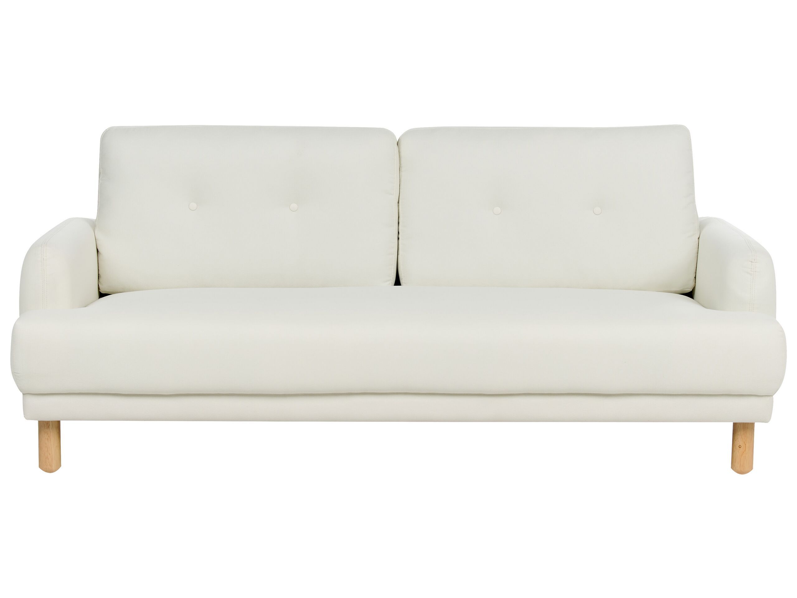 This upholstered sofa is going to be a focal point of your living space. Crafted out of durable, high quality polyester fabric, in timeless off-white colour, the piece will draw attention with its clean-lined design, thickly padded seat and buttoned backrest cushion. Additionally, the whole construction is placed on a set of wooden legs, which will highlight the retro design of the piece and guarantee stability. The couch is also easy to clean, as its pillows feature zippers, so you can quickly remove covers and wash them. Details: Color: White, Light Wood. Main material: Polyester. Additional material: Eucalyptus Wood, Rubberwood. Material Composition: 100% Polyester Weight: 51 Capacity: 3 People Assembly: Full Assembly Required Wood type: Hevea brasiliensis Wood Origin: China Cushions Dimensions: 56x46x15 Legs Height: 15 Padding Thickness: 20 Seat Height: 45