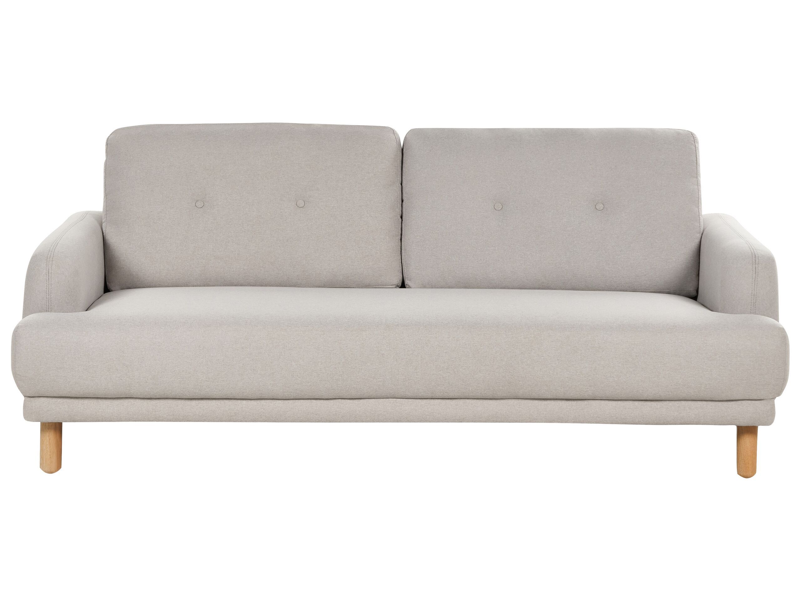 This upholstered sofa is going to be a focal point of your living space. Crafted out of durable, high quality polyester fabric, in timeless taupe beige colour, the piece will draw attention with its clean-lined design, thickly padded seat and buttoned backrest cushion. Additionally, the whole construction is placed on a set of wooden legs, which will highlight the retro design of the piece and guarantee stability. The couch is also easy to clean, as its pillows feature zippers, so you can quickly remove covers and wash them. Details: Color: Beige, Light Wood. Main material: Polyester. Additional material: Eucalyptus Wood, Rubberwood. Material Composition: 100% Polyester Weight: 51 Capacity: 3 People Assembly: Full Assembly Required Wood type: Hevea brasiliensis Wood Origin: China Cushions Dimensions: 56x46x15 Legs Height: 15 Padding Thickness: 20 Seat Height: 45