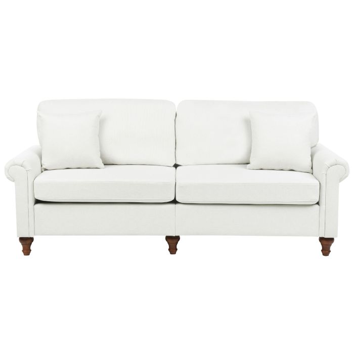 A modern 3-seater sofa with a Victorian flair fits well with contemporary and traditional interiors. Thickly padded cushions with removable covers are featured on the seats and on the backs, which are soft-to-touch yet resistant because of polyester upholstery. A robust frame, and legs, made from a solid wood, provide support and stability to the entire construction. It will easily become a favourite relaxation space in every home. Details: Color: White, Dark Wood. Main material: Polyester. Additional material: Oak Wood, Eucalyptus Wood. Material Composition: 100% Polyester Weight: 52 Capacity: 3 People Assembly: Partial Assembly Required Wood type: Eucalyptus deglupta Wood Origin: China Cushions Dimensions: 40x40 Legs Height: 12 Padding Thickness: 14 Seat Height: 44