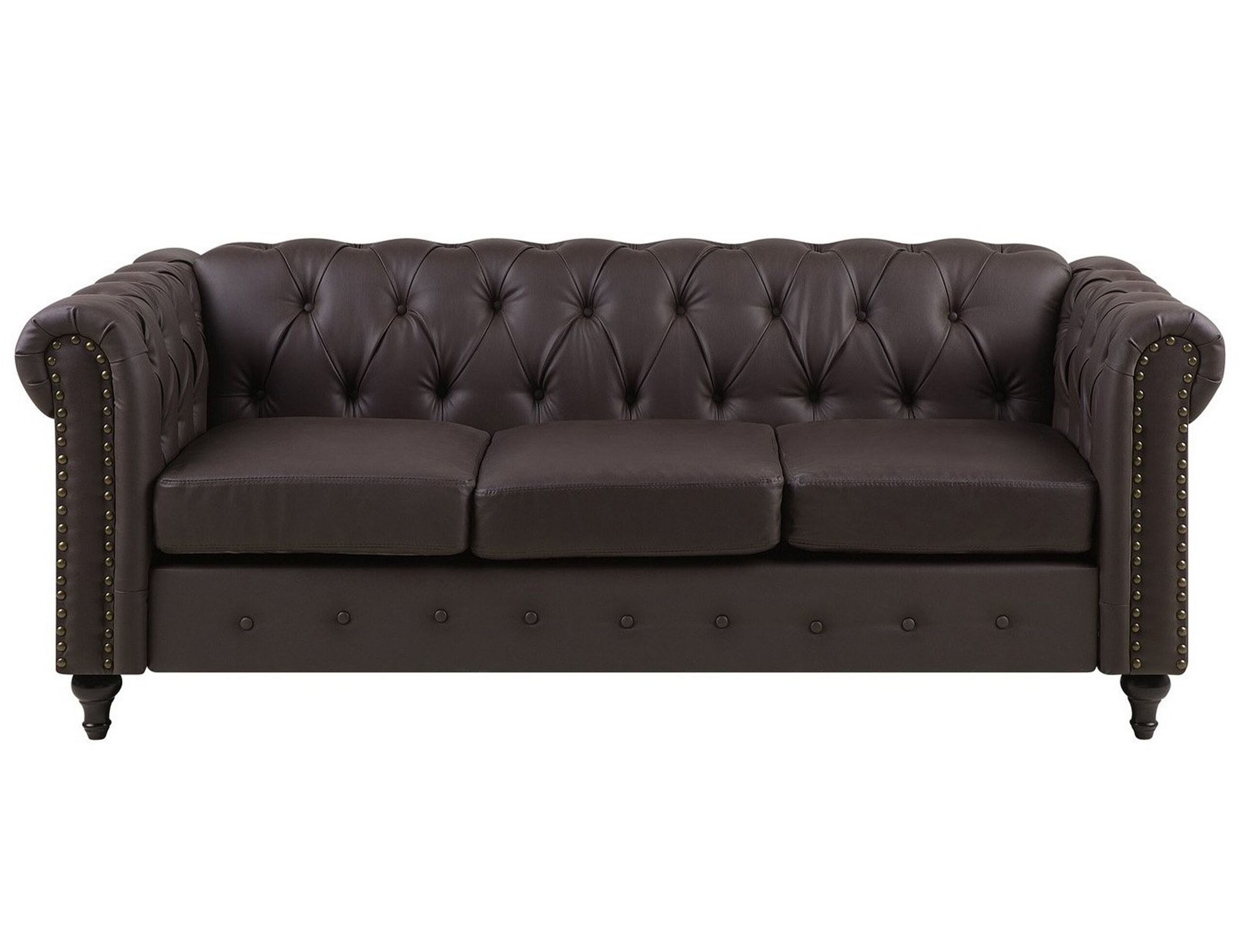 This elegant sofa with a classic Chesterfield design is a perfect highlight for interiors in vintage, retro, or glam decor. Its sturdy, wooden construction features soft to the touch and durable faux leather upholstery in classic brown. The scroll armrests, embellished with nailhead trim, beautifully complement the buttoned backrest and its diamond stitching, while the eucalyptus wood legs grant a minimalist touch to the piece. The highest level of comfort is reached thanks to three generously padded seat cushions, which give a touch of luxury to the sofa. The seat cushions feature a removable cover that translates to easy cleaning without a worry for stains. Details: Color: Brown. Main material: Faux Leather. Additional material: Eucalyptus Wood. Material Composition: 100% PU Leather Weight: 47 Capacity: 3 People Assembly: Full Assembly Required Wood type: Eucalypteae Wood Origin: China Legs Height: 14 Padding Thickness: 15 Seat Height: 48