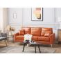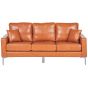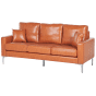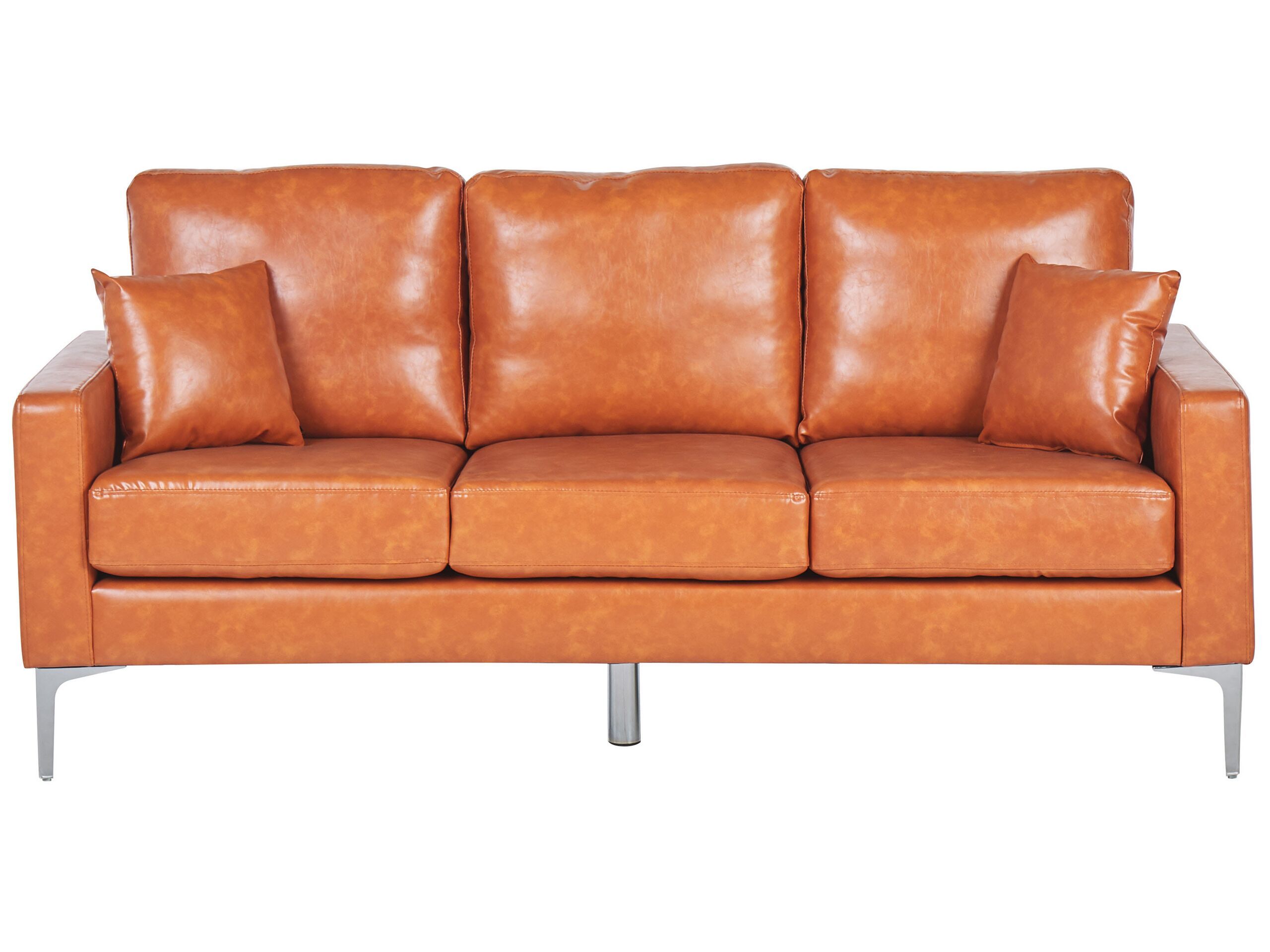 A classic three-seater sofa that brings an elegant accent to any interior. Upholstered in high-quality faux leather in a golden brown tone, the sofa features generously padded seat and back cushions which guarantee the ultimate sitting comfort. The additional cushions feature a removable cover that translates to easy cleaning without a worry for stains. The sleek, simple design is highlighted by the silver, metal legs that add an industrial feel to the piece. The sofa looks especially inviting in minimalist rooms and lofts. Details: Color: Brown, Silver. Main material: Faux Leather. Additional material: Metal, Eucalyptus Wood. Material Composition: 100% Polyester Weight: 44 Capacity: 3 People Assembly: Legs to be Fitted Wood type: Eucalypteae Wood Origin: China Cushions Dimensions: 32x32 Legs Height: 18 Padding Thickness: 14 Seat Height: 43
