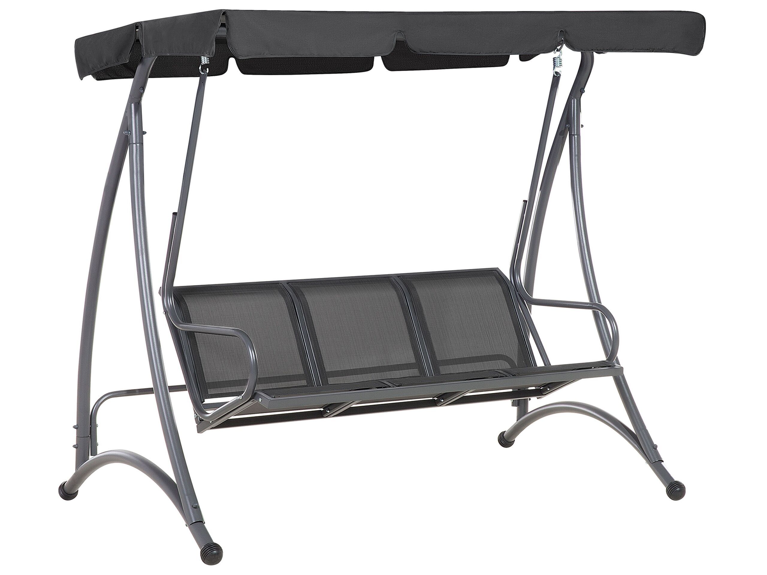 A delightful garden swing is a great addition to your outdoor space. Crafted with care and precision, it is made of powder-coated steel and synthetic fabric. Wide and comfortable seat swings delightfully in the shade of board canopy, protecting from sun rays and letting you enjoy blissful relaxation. Details: Color: Black. Main material: Mesh. Additional material: Steel, Polyester. Weight: 40 Capacity: 3 People Assembly: Full Assembly Required Weight Capacity: 280 Seat Height: 46