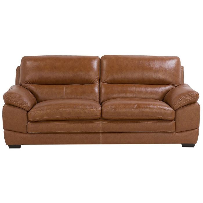 Enjoy instant relaxation in this cosy, sumptuous sofa. Robust and stable, it offers a durable construction and birchwood legs. Wide, deep, with an inviting cushioned seat, this piece is made from high-quality leather upholstery on all areas that come into contact with skin. The sides and back are finished with faux lather, maintain its condition with minimum effort. Its neutral golden-brown shades are ideal for complementing a range of interiors from retro to contemporary. Details: Color: Brown. Main material: Leather. Additional material: Plywood, Birch Wood. Weight: 68 Capacity: 3 People Assembly: Legs to be Fitted Wood type: Betula chinensis Wood Origin: China Cushions Dimensions: 18x53x70 Legs Height: 4 Padding Thickness: 18 Seat Height: 41