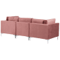 Bring home a modular sofa that will allow you to adjust your seating arrangement any time you want. With two corner sections and a 1-seat module you can create a piece of furniture that completely suits your living area. Position the ottoman on one end to extend the corner or use it as a footstool. Each element comes with thickly filled cushions encased in sumptuous velvet upholstery. Paired with glossy metal, silver legs for a clean, contemporary look this sofa will make a splendid centrepiece. Details: Color: Pink. Main material: Velvet. Additional material: Metal, Eucalyptus Wood. Material Composition: 100% Polyester Weight: 66 Capacity: 3 People Assembly: Partial Assembly Required Wood type: Eucalyptus grandis Wood Origin: China Cushions Dimensions: 69x35 Legs Height: 15 Padding Thickness: 16 Ottoman Dimensions: 85x85x48 Seat Height: 48