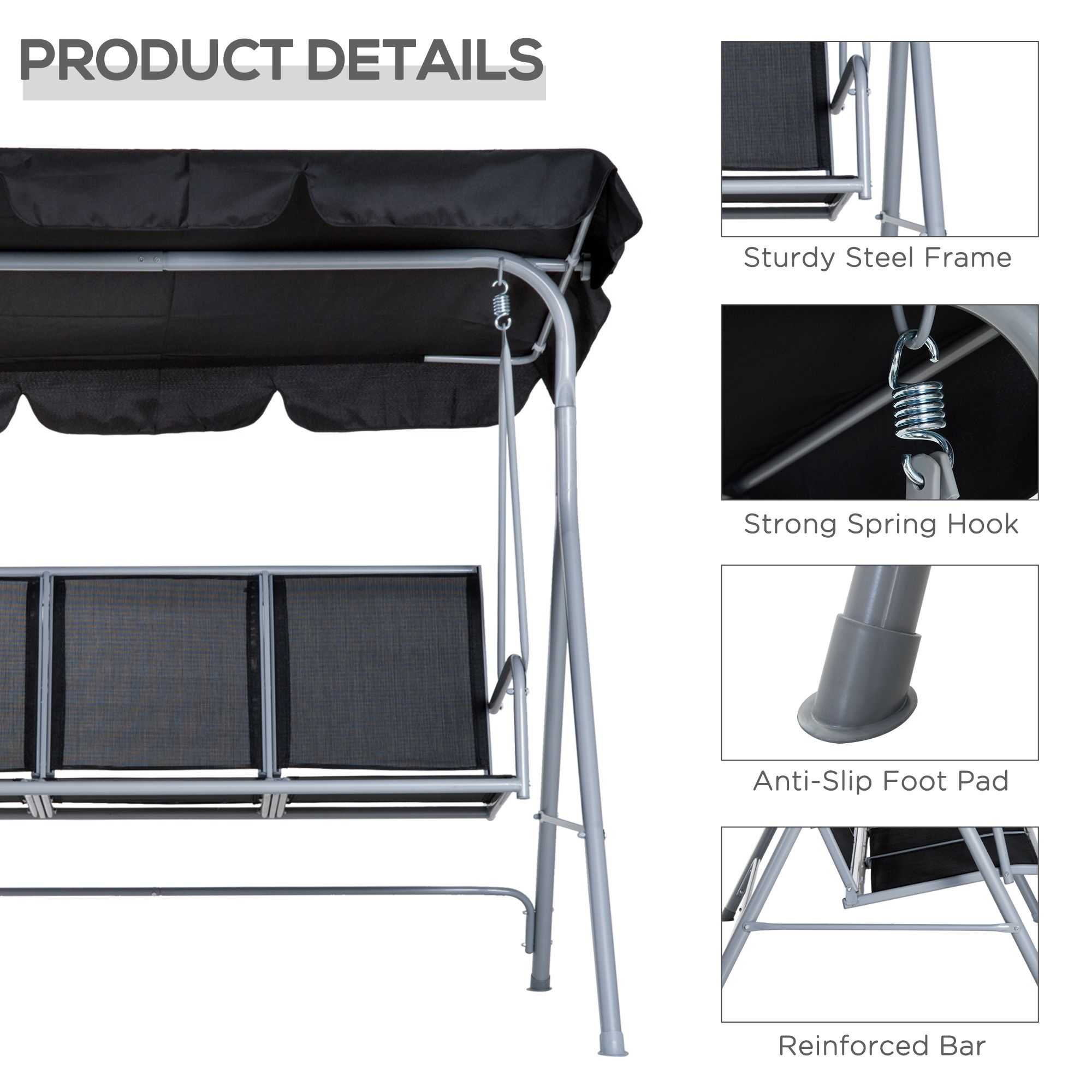 - STEEL FRAME: 'A' shape for even stability, with a powder coating for swing seats for adults's extra strength and durability. Foot pads on swing bench's legs for balance and floor protection. COMFORTABLE: Features texteline seat and back for breathability, high and slightly angled back and armrests