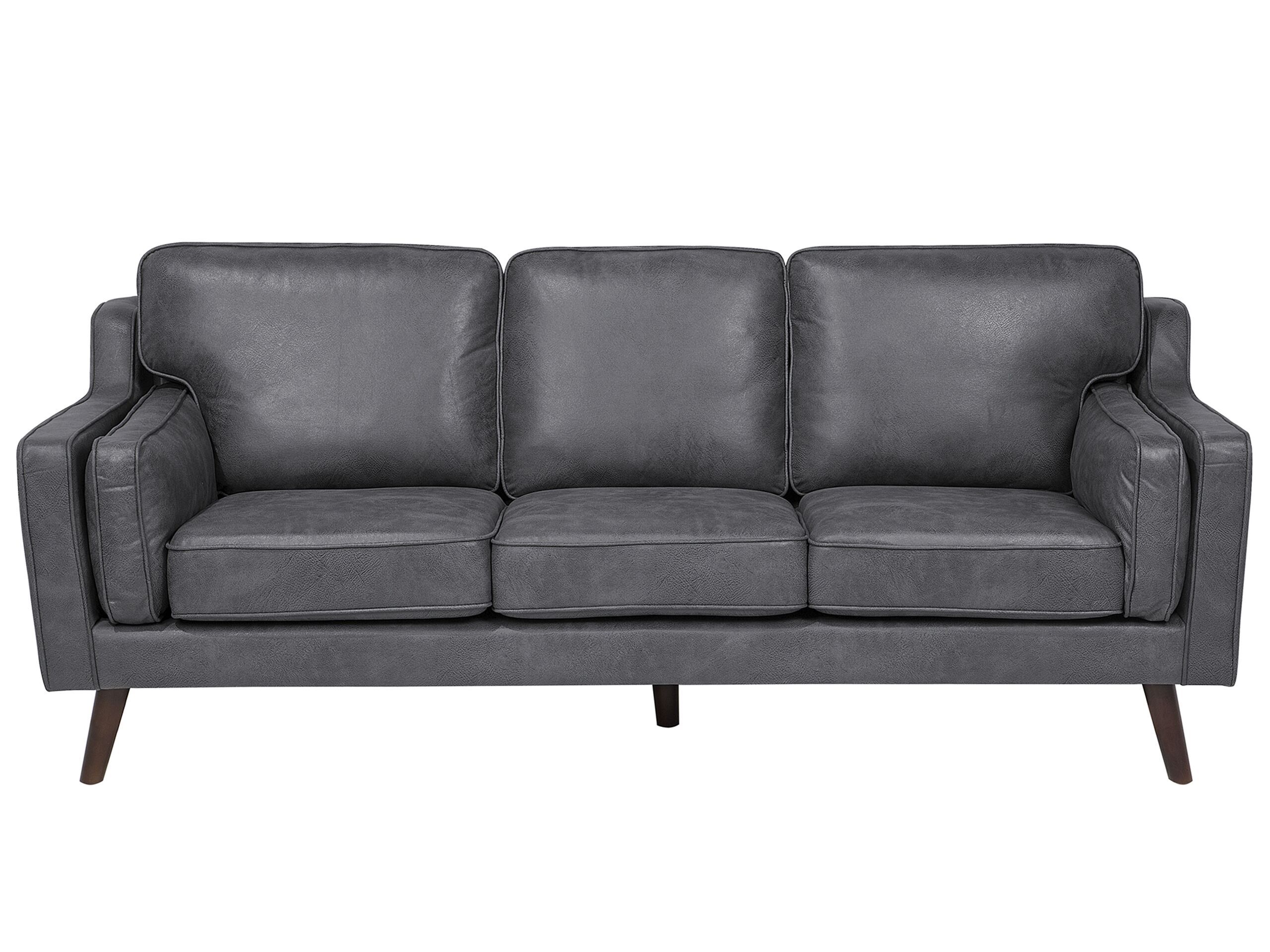 Elegant sofa, fully upholstered in high-quality polyester that perfectly replicates the feel and looks of genuine leather. Thickly padded cushions with removable covers and double armrests guarantee pleasant sitting. The mid-century design highlighted by slanted oak wood legs matches all modern and traditional interiors. It works well combined with matching sofa from the same collection, but can also work as a part of eclectic arrangement with various armchairs and couches. Details: Color: Grey, Dark Wood. Main material: Faux Leather. Additional material: Oak Wood, Solid Wood. Material Composition: 100% Polyester Weight: 45 Capacity: 3 People Assembly: Full Assembly Required Wood type: Quercus mongolica Wood Origin: China Cushions Dimensions: 63/51x46 Legs Height: 18 Padding Thickness: 11 Seat Height: 39