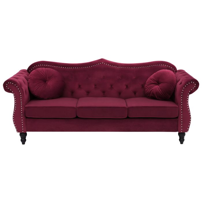 Enhance your interior with this elegant and glamorous sofa. Featuring tufted backrest and armrests, paired with nailhead trim, this piece is truly one of a kind, elevating any space to a higher level. Its design, heavily inspired by retro and vintage decor, easily fits within any living room or office space. Made from high-quality materials, it is incredibly durable, while its surface is covered with smooth to touch and easy to take care of velvet. Legs of the piece are made out of solid wood, which reinforce stability. The sofa comes with two throw pillows that feature a removable cover that translates to easy cleaning without a worry for stains, in matching colour and design Details: Color: Red, Black. Main material: Velvet. Additional material: Pine Wood, Eucalyptus Wood. Material Composition: 100% Polyester Weight: 55 Capacity: 3 People Assembly: Full Assembly Required Wood type: Pinus massoniana, Eucalyptus grandis Wood Origin: China Cushions Dimensions: 44x44 Legs Height: 16 Padding Thickness: 13 Seat Height: 44