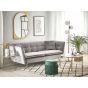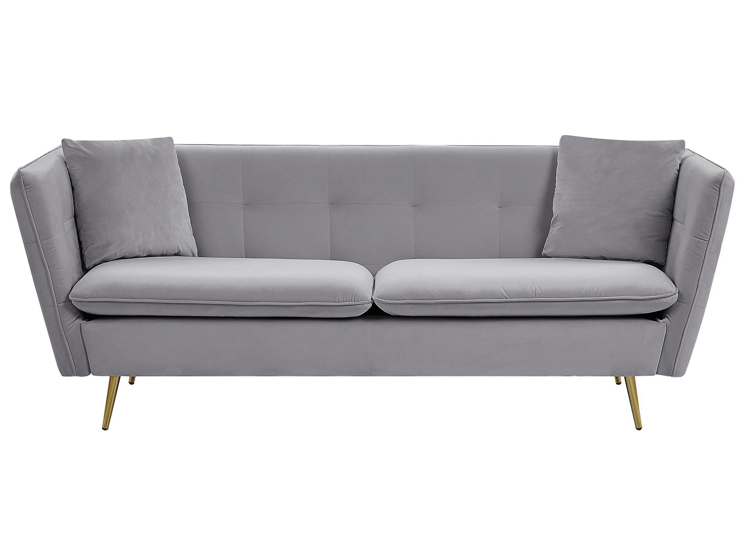 Let your sofa take the centre stage with the elegant, geometric lines and rich texture of the upholstery. Channelling the flamboyant retro style this 3-seater comes covered in sheen velvet that makes its straightforward silhouette stand out. The square tufting on the outline mixes wonderfully with slim, gold-painted, metal legs to create furniture that captures perfectly the glamour trend. Thanks to the well-balanced sophisticated look this sofa will take up a notch your living area décor. Details: Color: Grey, Gold. Main material: Velvet. Additional material: Pine Wood, Metal, Eucalyptus Wood. Material Composition: 100% Polyester Weight: 44 Capacity: 3 People Assembly: Full Assembly Required Wood type: Pinus massoniana, Eucalyptus grandis Wood Origin: China Cushions Dimensions: 38x38 Legs Height: 17 Padding Thickness: 26 Seat Height: 43