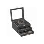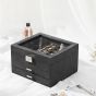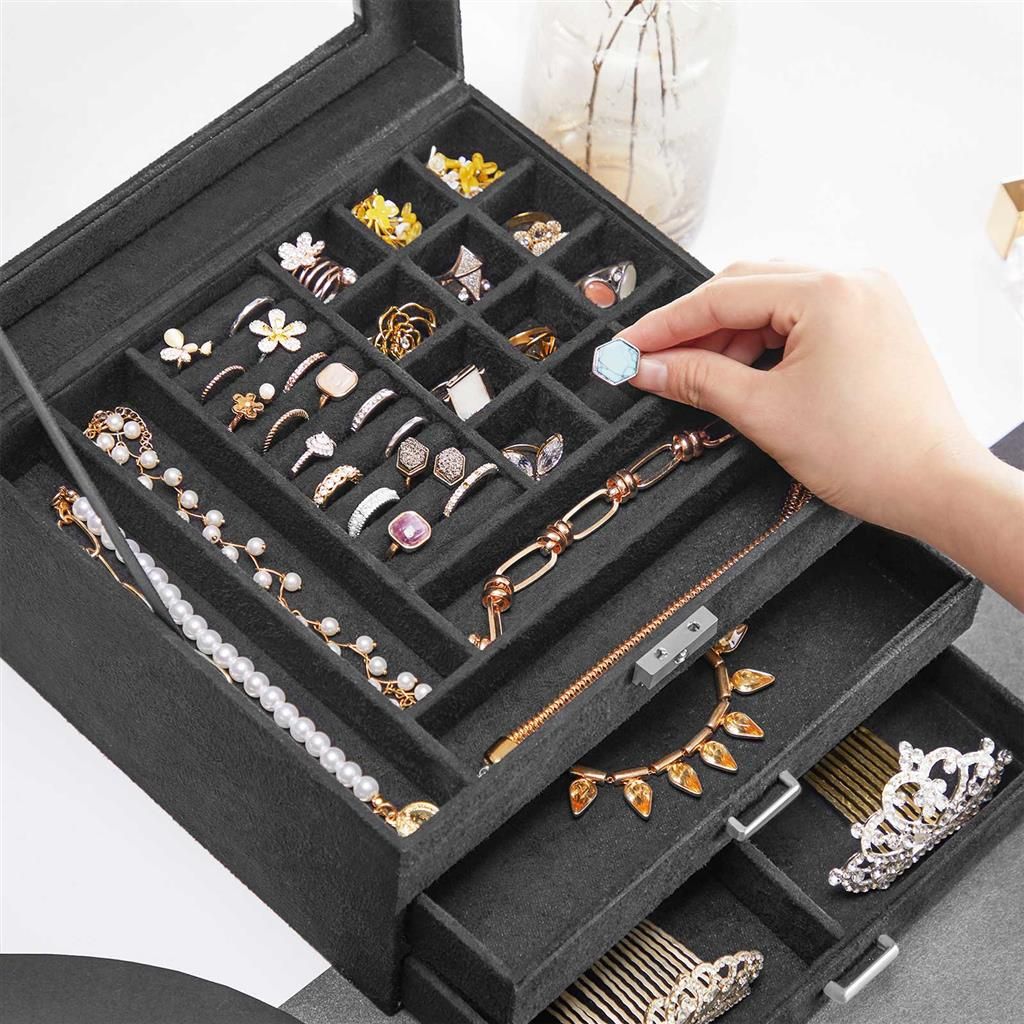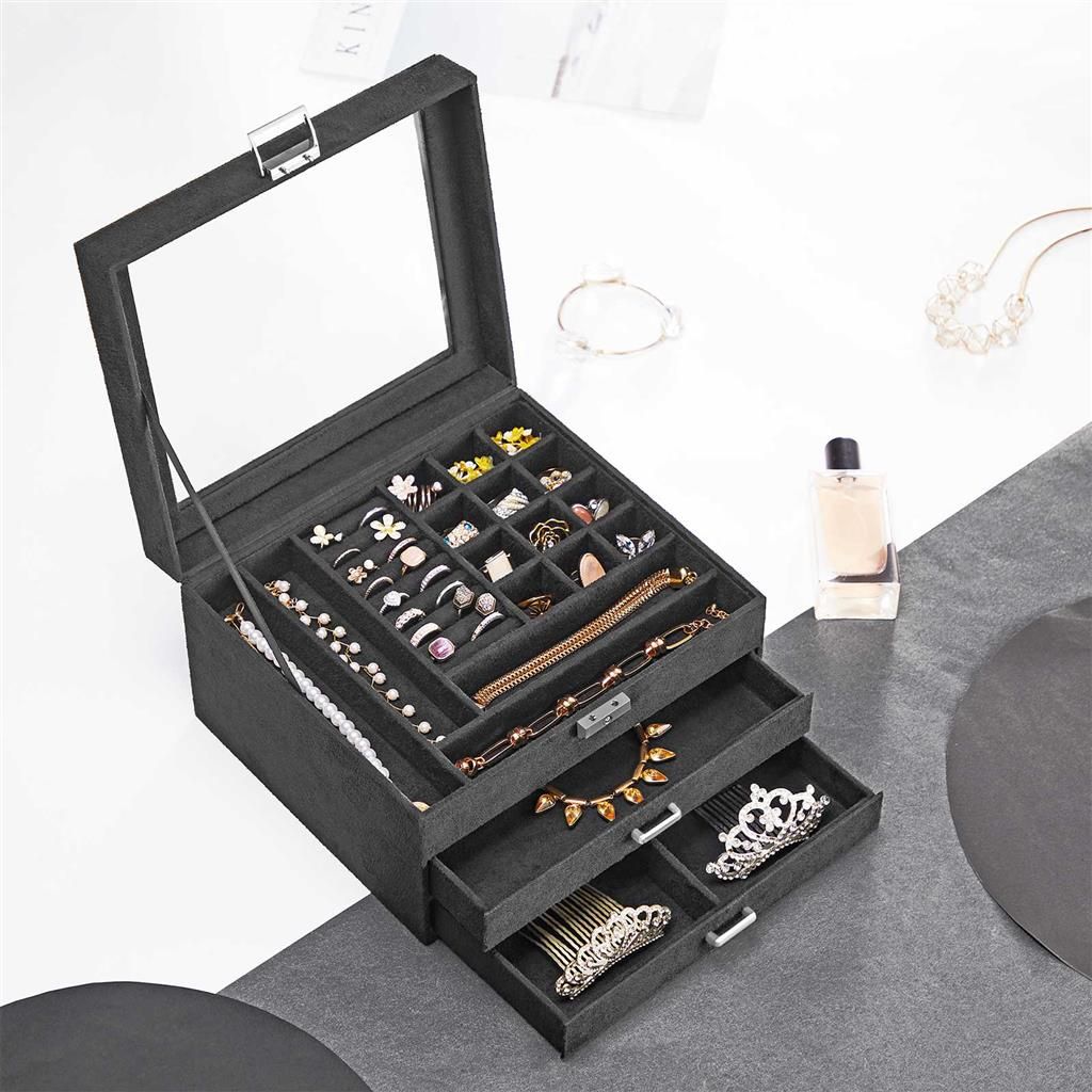 Lucky for Jewellery Lovers: Couldn't stop ogling at shiny, sparkling jewellery and end up bringing home more? Couldn't find one of the earrings in a pair that hasn't been worn for a while? This 3-tier velvet jewellery box with a velvet texture and oodles of storage knows how important it is to keep your collection stylishly organised and safe.The Shining Points of This Jewellery Case that You Can't Miss Out On:Wrapped in soft, durable velvet inside and outside;Constructed with an engineered wood structure;Topped with a clear glass window;Detailed with neat stitching and zinc alloy pulls;Finished in a classic grey colour;Features 2 removable drawers, 8 ring rolls, 12 cubes, and 4 long slots.