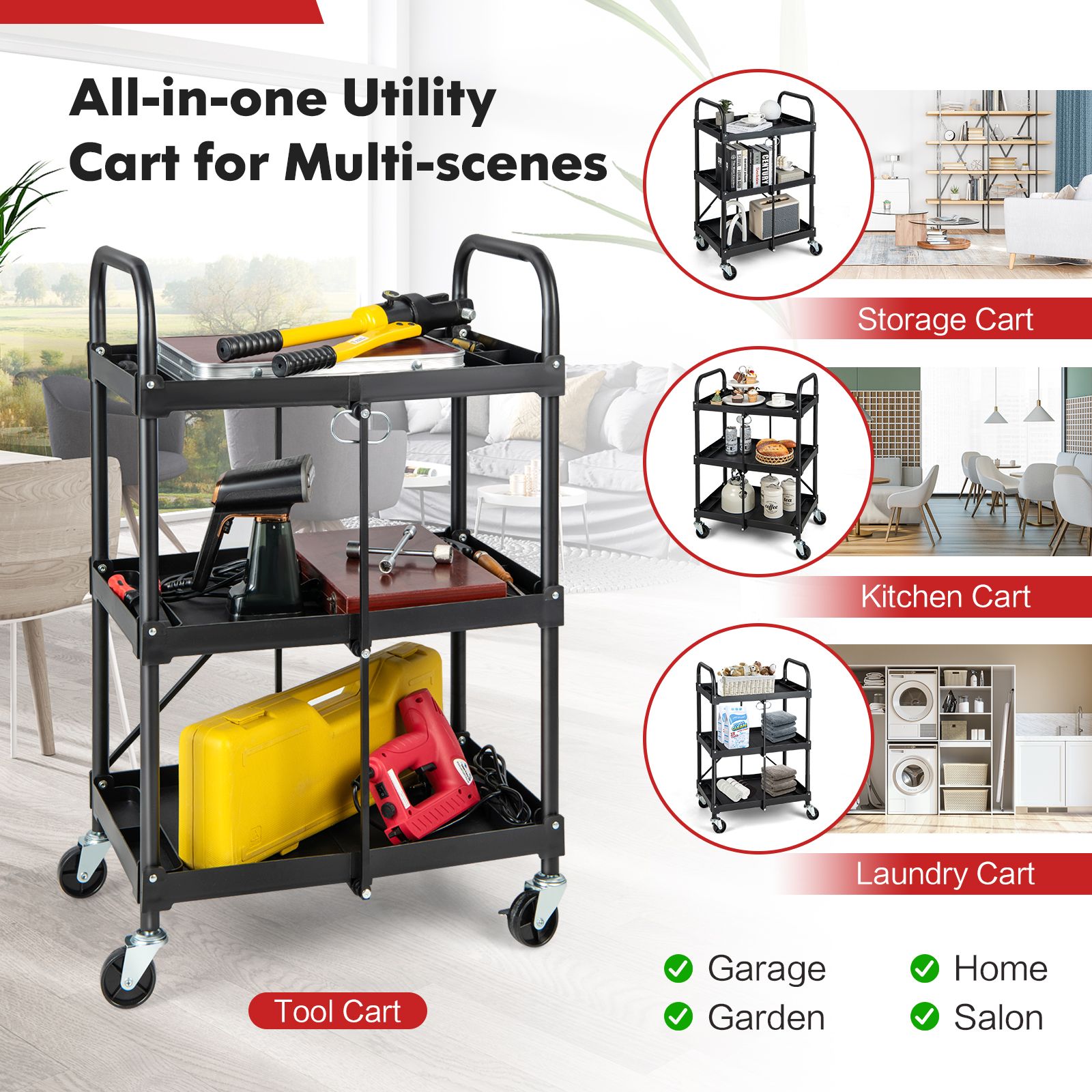 3 Tiers Folding Tool Trolley with Lockable Wheels and Tool Grooves