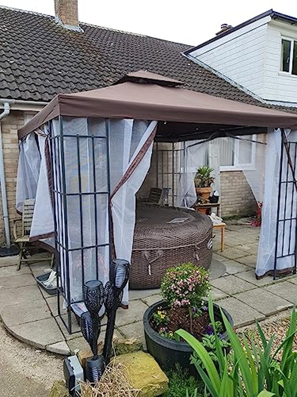 This 3m x 3m gazebo is a great way to expand outdoor space. The steel frame makes it extra sturdy, formed into a spacious 3m x 3m size - you can host plenty of people at once. The polyester canopy creates mild shelter below, with its two-tier design helping to promote airflow in and out. Mesh netting to shield you from annoying bugs and more. Complete with anchoring accessories. You deserve some comfort in the sun: create your own personal oasis with our permanent gazebo.