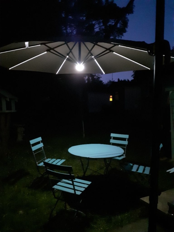 - SOLAR POWERED LED LIGHTS: Placed on the support ribs of the led parasol, they illuminate your garden beautifully at night - great for extending time outdoors. Charge in the sunlight, controlled by a switch.