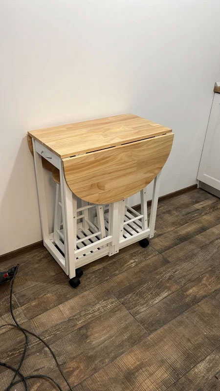3PC Wooden Kitchen Cart Mobile Rolling Trolley Folding Bar Table Two Stools Dining Chair Storage Shelf w/2 Drawers & 6 Wheels