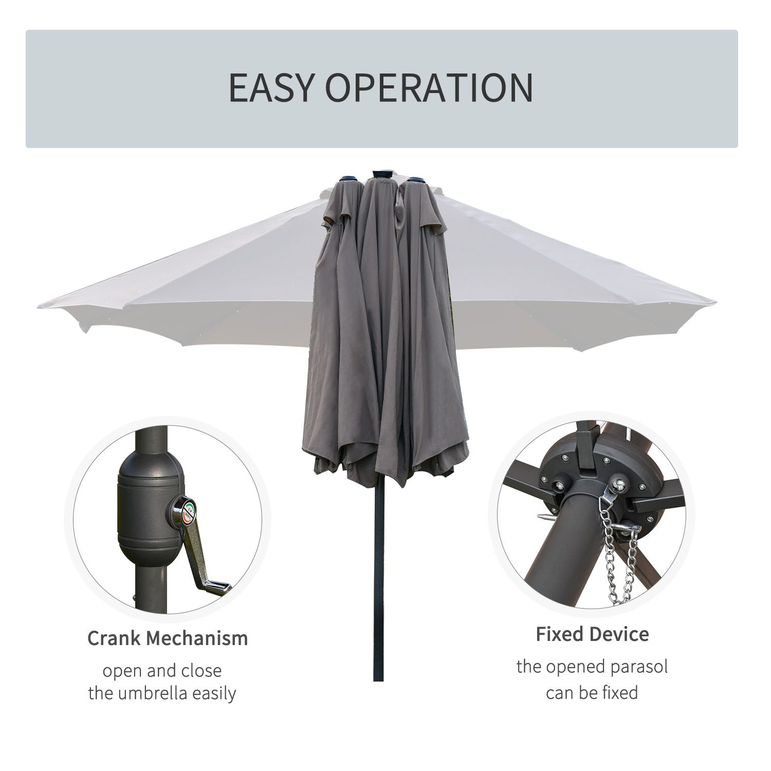 - EASY TO USE: Comes with the easy-to-turn crank system located on the side of the led parasol pole for easy opening and closing. 12 metal ribs connecting pole and garden shelter for added support