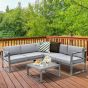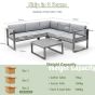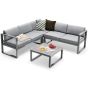 Enjoy optimal comfort with this 4-piece aluminium sofa set! Constructed of heavy-duty aluminium, the main frame of the sofa set is of high stability and won't easily rust or deform. With a large sitting area, the sofas with 4" thickened cushions offer you much cosiness to sit, making you fully relaxed. The slatted coffee table also provides much convenience for you to fetch snacks and drinks. Moreover, the cushion cover is removable and washable thanks to the zipper design. And the fixing ropes effectively keep the cushions in place. The whole sectional sofa set looks elegant and stylish, which fits different occasions well. Thus, it will be a perfect addition to both indoor and outdoor places for relaxation. Solid Aluminum Frame: Featuring heavy-duty aluminum structure, the main frame of the L shape garden corner sofa set resists to rust and deformation, ensuring long-lasting service life and high stability. Each loveseat can load 300kg and the corner sofa can load 150kg. Moreover, the frame made of aluminum is much lighter than others. Soft and Thickened Cushions: Equipped with 5 seat cushions and 6 back cushions with 10cm thickness, all the 3 sofas are quite soft to sit. High-density fillings of cushions make you fully relaxed with more comfort. And the cushion cover is easy to remove and wash with the smooth zippers. Also, the fixing ropes prevent the cushions from moving around. Thoughtful Details: Both the seats and tabletop of the patio furniture set are easy to maintain thanks to the slatted design. Each sofa is designed with anti-slip footpads to protect the ground from scratches. And the footpads of coffee table are adjustable to improve the overall stability. Multiple Suitable Places: With modern appearance and high-level comfort, this 4-piece garden furniture set is ideal for both indoor and outdoor occasions, such as backyard, patio, poolside and living room. The spacious sitting area makes you enjoy more with best friends or family. 3-Package Delivery: This 4pcs aluminum outdoor conversation set will be delivered in 3 packages so the arriving time may vary. And the screw bag for the whole set is in box 3. With the clear instruction, you can finish the assembly in higher efficiency. Dimension of loveseat: 129 x 64 x 65cm(L x W x H). Dimension of corner sofa: 64 x 64 x 65cm (L x W x H). Dimension of coffee table: 68 x 68 x 36cm(L x W x H).