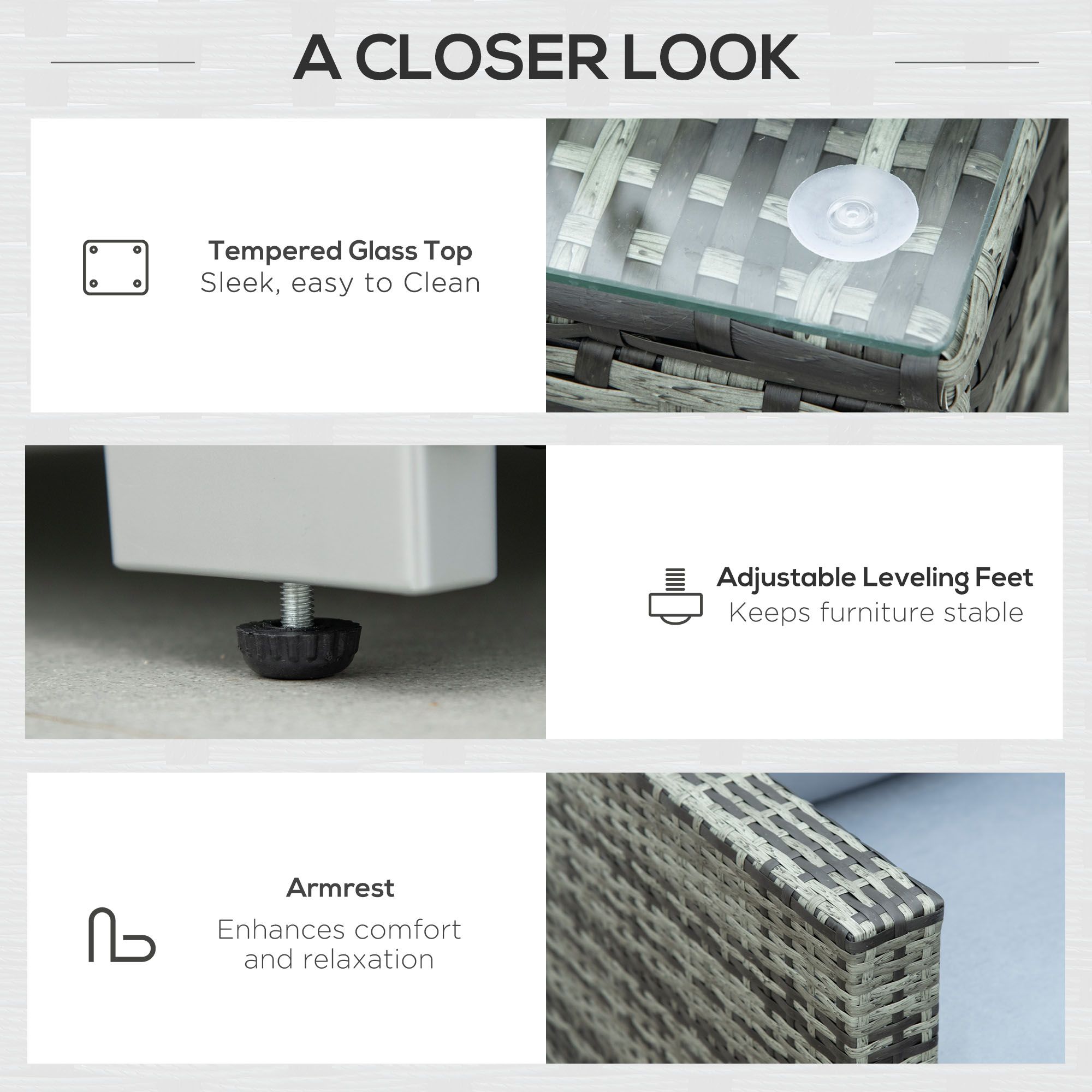 - Material: Steel frame, PE rattan, Polyester, Tempered glass