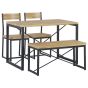 Create a stylish and functional dining room with this furniture group. The 4-pieces set, comprising a table, two chairs and a bench, provides a comfortable place to sit. A timeless combination of black metal legs with a wood effect MDF board will fit into modern, industrial and traditional interiors. Details: Color: Light Wood, Black. Main material: MDF. Additional material: Steel, MDF. Weight: 26 Capacity: 4 People Assembly: Full Assembly Required Overall Dimensions: 110x70x76 Table Dimensions: 110x70x76 Bench Dimensions: 90x37x45 Chair Dimensions: 39x39x86 Seat Height: 45