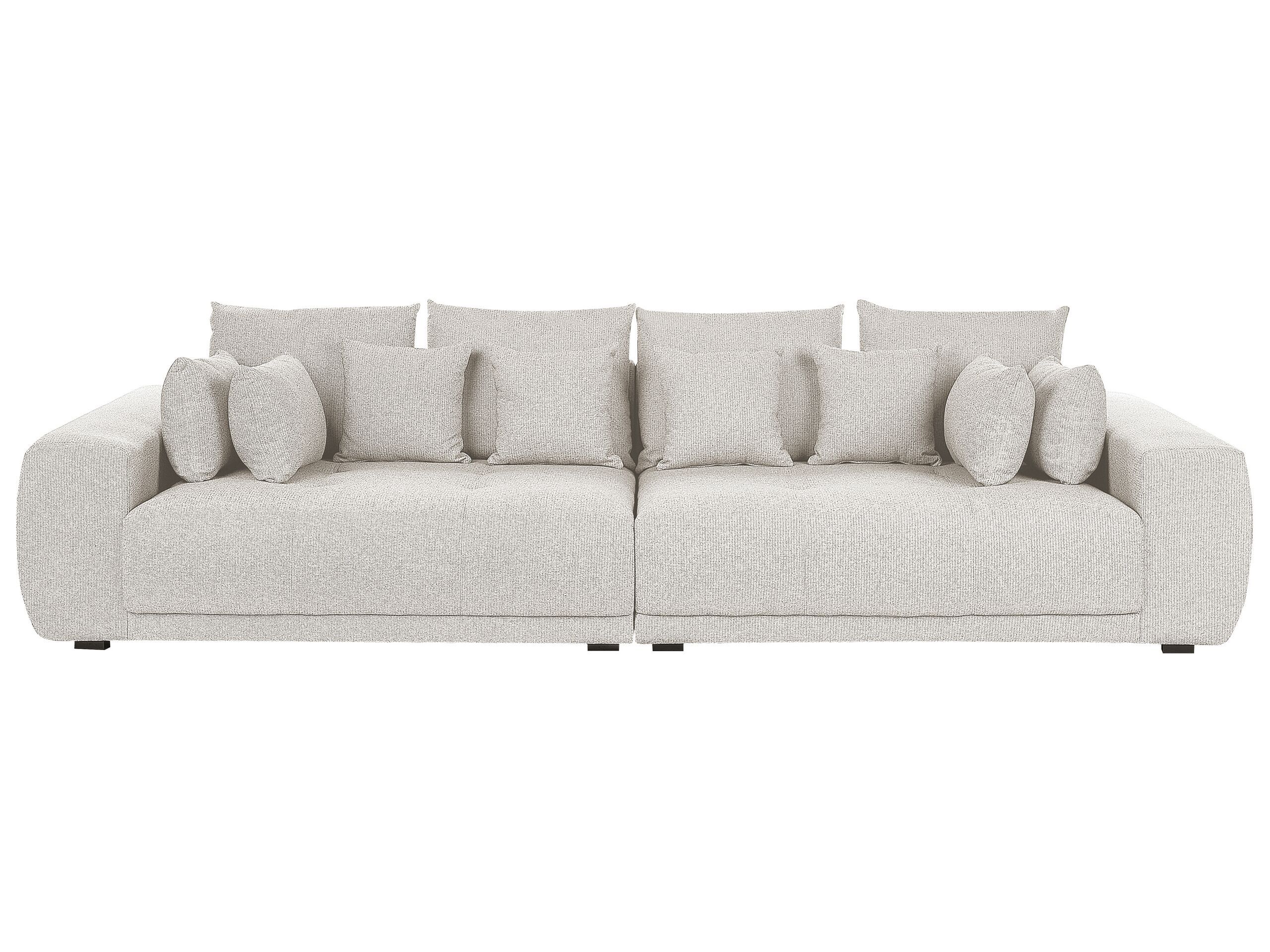 This extraordinary, oversized living room sofa is a perfect centrepiece for any home, especially one with plenty of space for designer furniture. Made for an ultimate relaxing experience, it provides a thickly padded seating surface, large enough that you can fully stretch your legs and enjoy the exceptional comfort. The light colour palette is subtle and soft, making it an ideal choice to blend with any modern interior. The sofa is placed on wooden legs which offer stability. Details: Color: Beige, Black. Main material: Polyester. Additional material: Eucalyptus Wood. Material Composition: 100% Polyester Weight: 60 Capacity: 4 People Assembly: Partial Assembly Required Wood type: Eucalypteae Wood Origin: China Cushions Dimensions: 36x62x13 Legs Height: 6 Padding Thickness: 35 Seat Height: 41