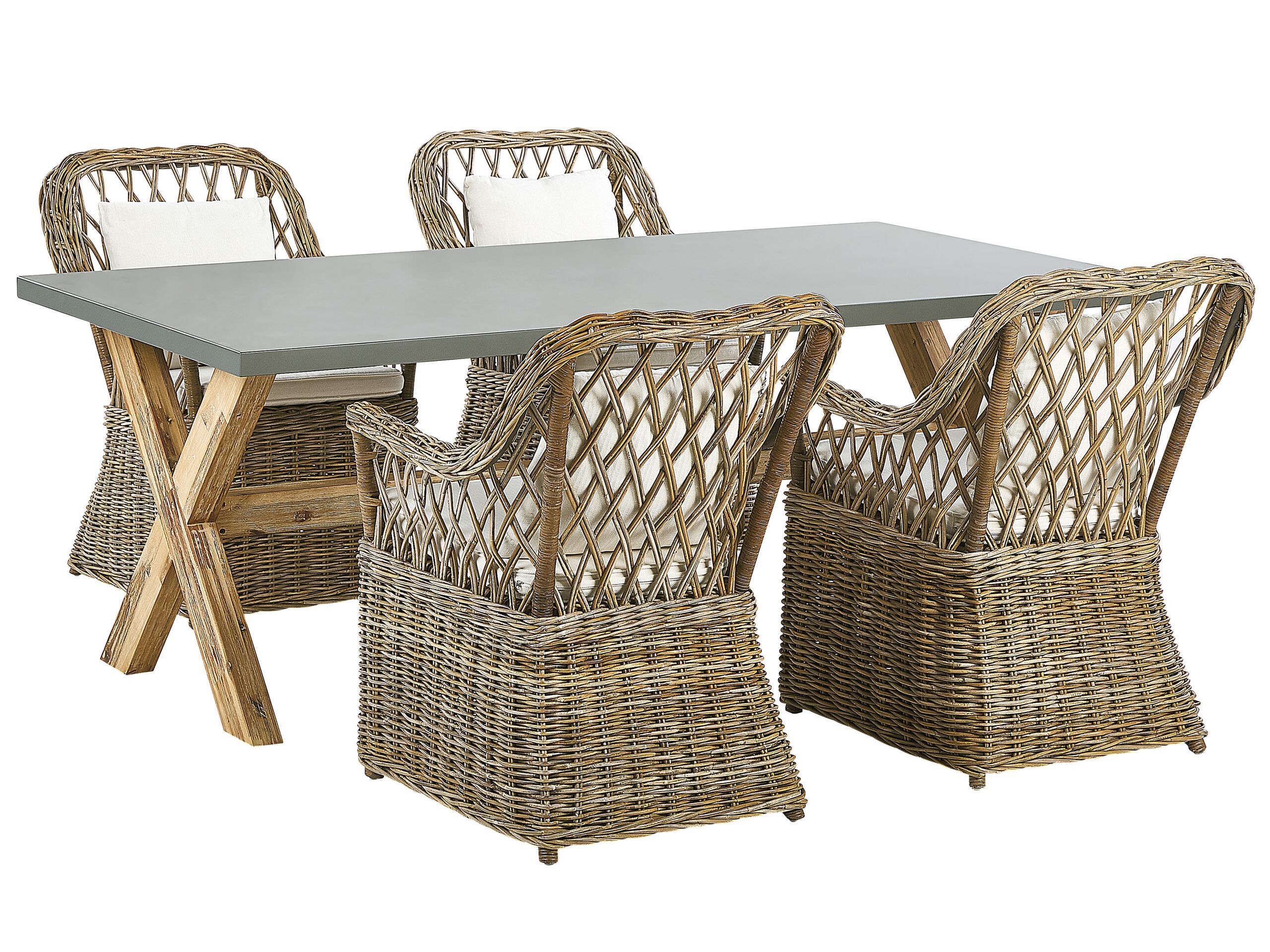 Get ready for the summer, and turn your patio into a stylish dining area. This set, consisting of a capacious table and 4 rattan chairs, will guarantee the highest comfort. The table top is made from durable fibre cement, which ensures the longevity of the table, while being easy to care for. The chairs boast a boho-inspired weaving, makes them stand out in any setting. They also come with matching, cotton seat and back cushions with removable cases for easy cleaning, and leg caps that protect the floor from scratching. Details: Color: Natural, Grey, Beige, White, Light Wood. Main material: Fibre Cement. Additional material: Mahogany, Cotton, Acacia Wood. Material Composition: 100% Cotton Weight: 84 Capacity: 4 People Assembly: Partial Assembly Required Wood type: Acacia mangium Wood Origin: Vietnam Overall Dimensions: 200x100x75 Table Dimensions: 200x100x75 Chair Dimensions: 60x70x90 Padding Thickness: 5 Seat Height: 42