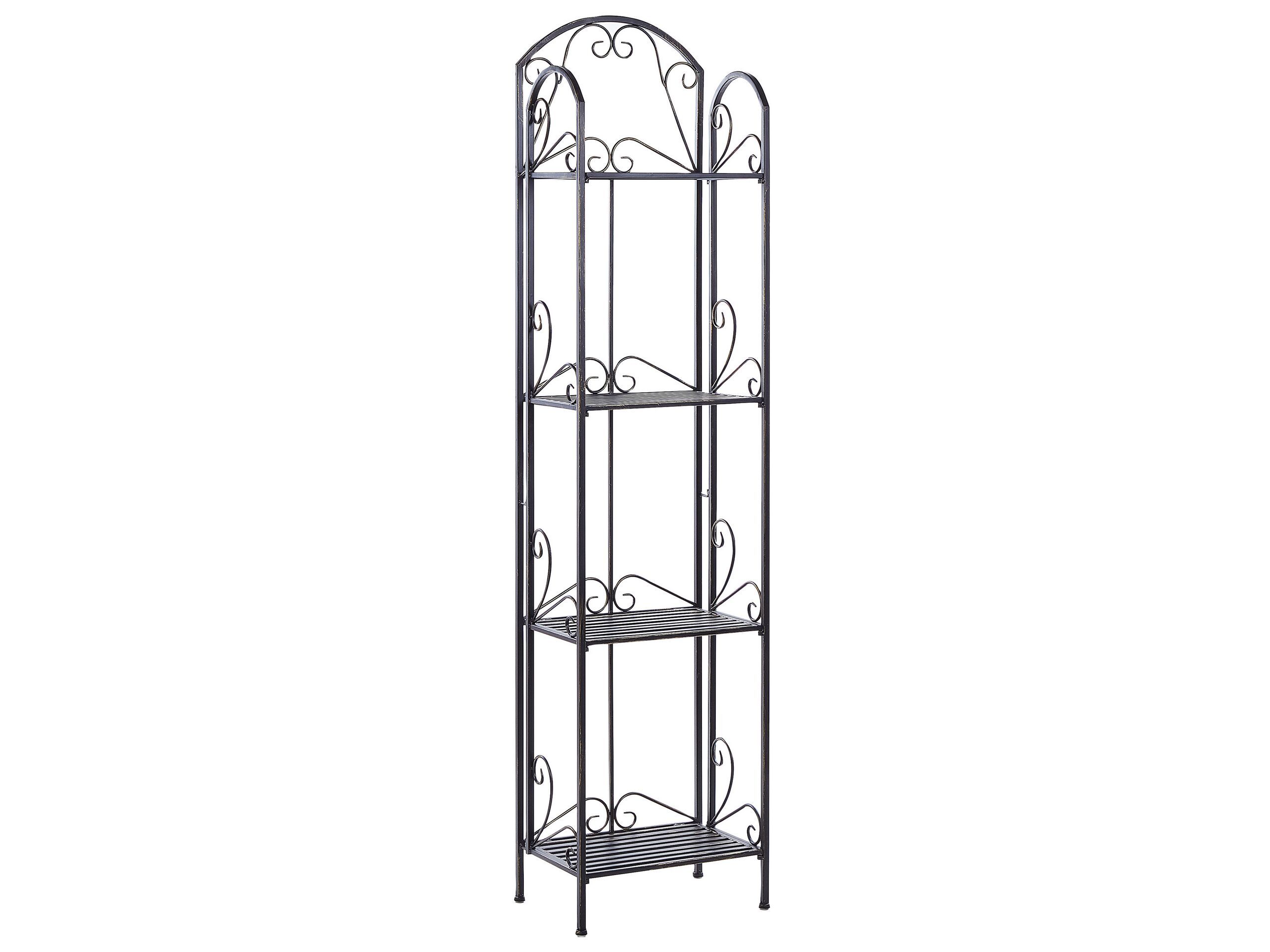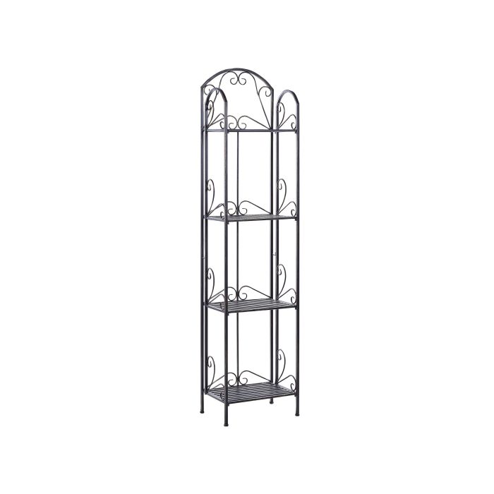 This shelving unit equipped with four shelves will find its place almost anywhere, be it in the bathroom, hallway or on the balcony. A solid, distressed metal frame with vintage decorative accents makes it suitable for both country and rustic interiors. The piece is extremely easy to care for, it is enough to wipe it with a cloth, while also remaining durable. Details: Color: Black. Main material: Iron. Weight: 8 Assembly: Does Not Require Assembly Weight Capacity: 120