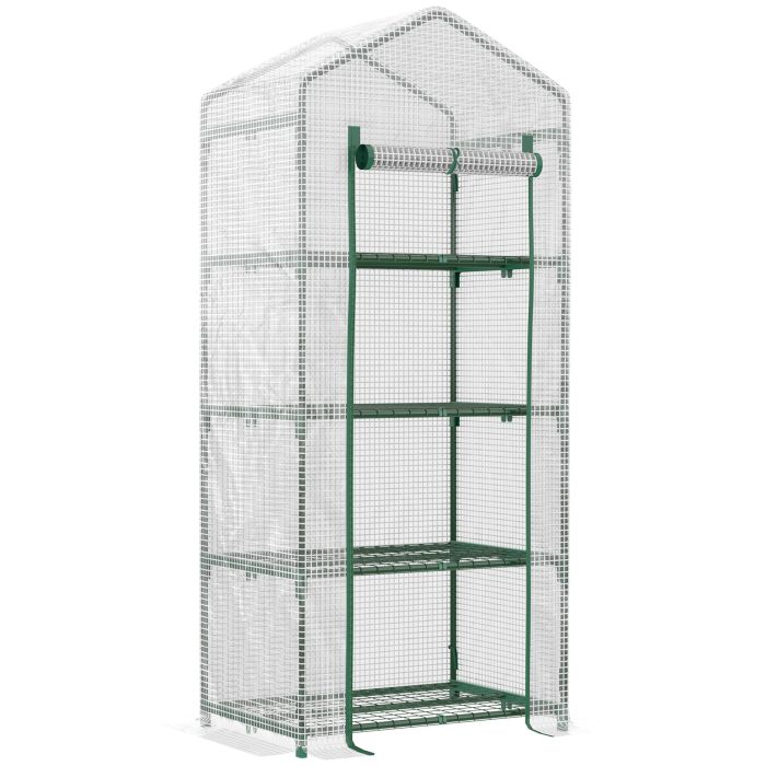 4 Tier Mini Greenhouse, Portable Green House with Steel Frame, PE Cover, Roll-up Door, 70 x 50 x 160 cm, White