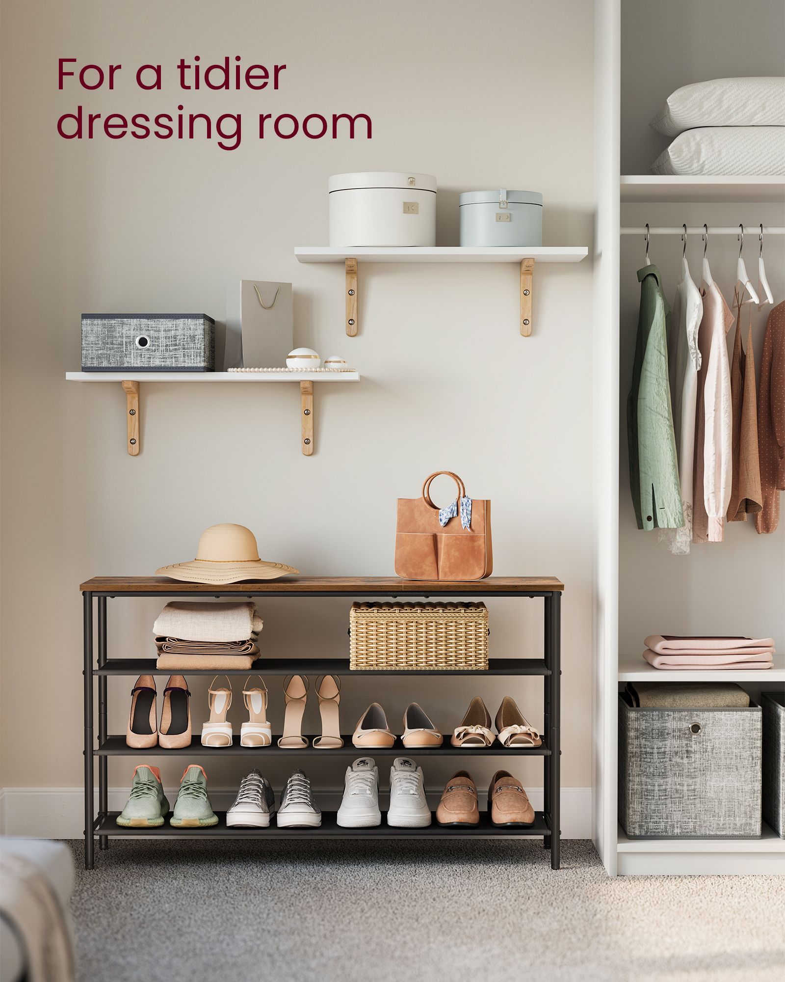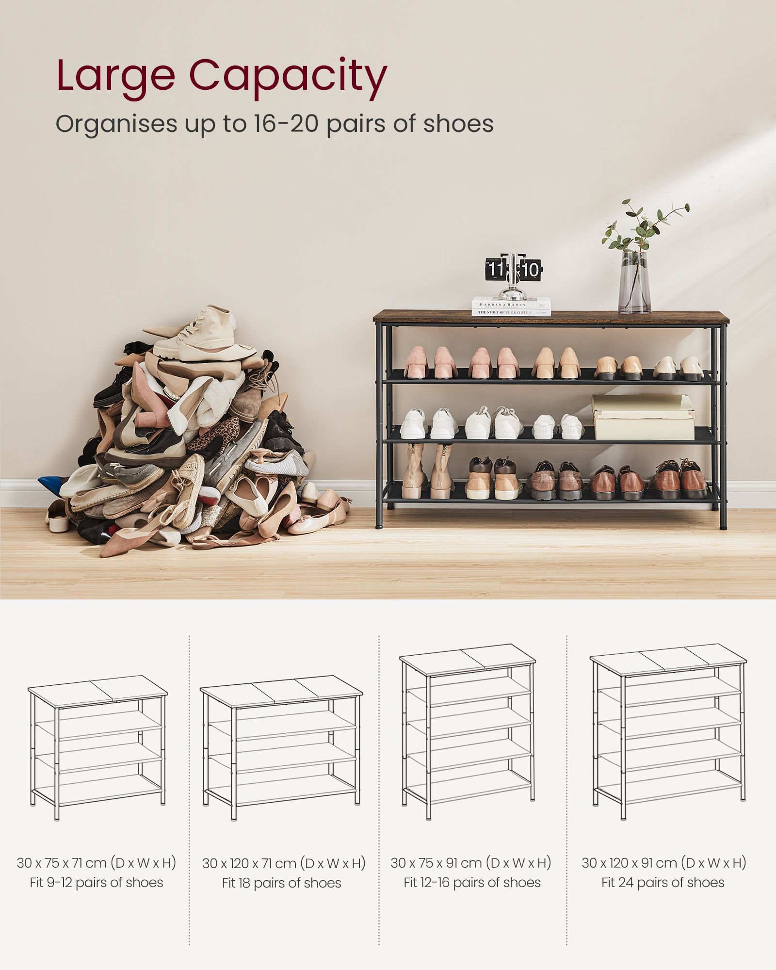 Introducing our 4-Tier Shoe Rack, the ultimate solution for organizing your footwear collection. With its four spacious tiers, this rack provides ample storage space while maximizing vertical space efficiency. Its sturdy construction ensures durability, while its sleek design adds a touch of elegance to any room. Keep your shoes neatly organized and easily accessible with this versatile and practical storage solution.