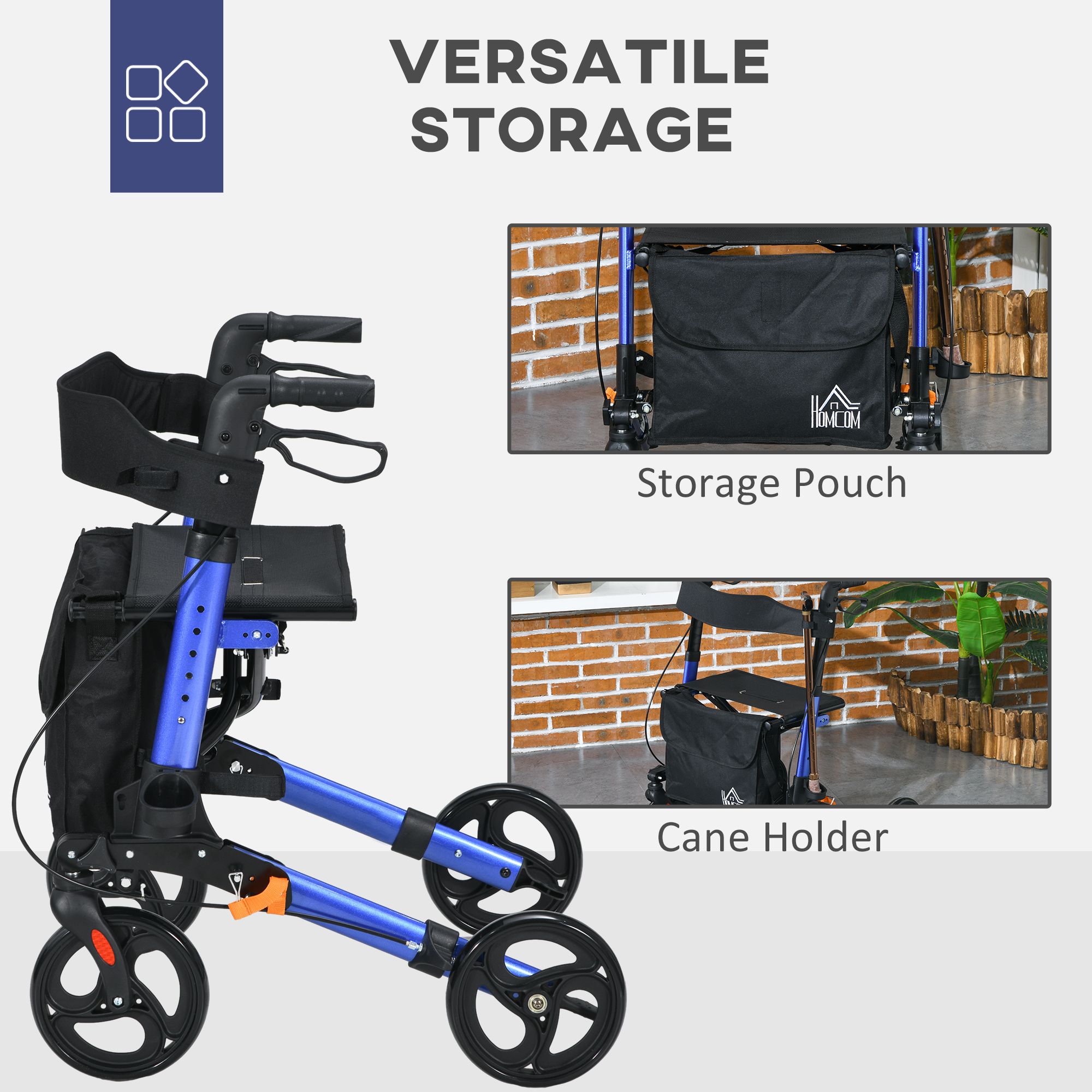 This HOMCOM lightweight rollator walker rolls with you, making journeys stress free. A powder coated aluminium frame for a strong, yet lightweight core, it is fitted with a seat so you can take a break whenever you want. It can be folded into a smaller size for convenient storage and transport. A storage bag to take small essentials with you on the journey. Four wheels for smooth movement, this mobility walker is complete with a dual brake for safety.