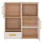 2 door 1 drawer cupboard with 2 open shelves in light oak and white high gloss with orange handles. This neutral and functional kids collection is perfect for all age groups, finished in light oak and stunning white high gloss. Clever design with 2 doors and I drawer this unit has 2 open shelf display areas.