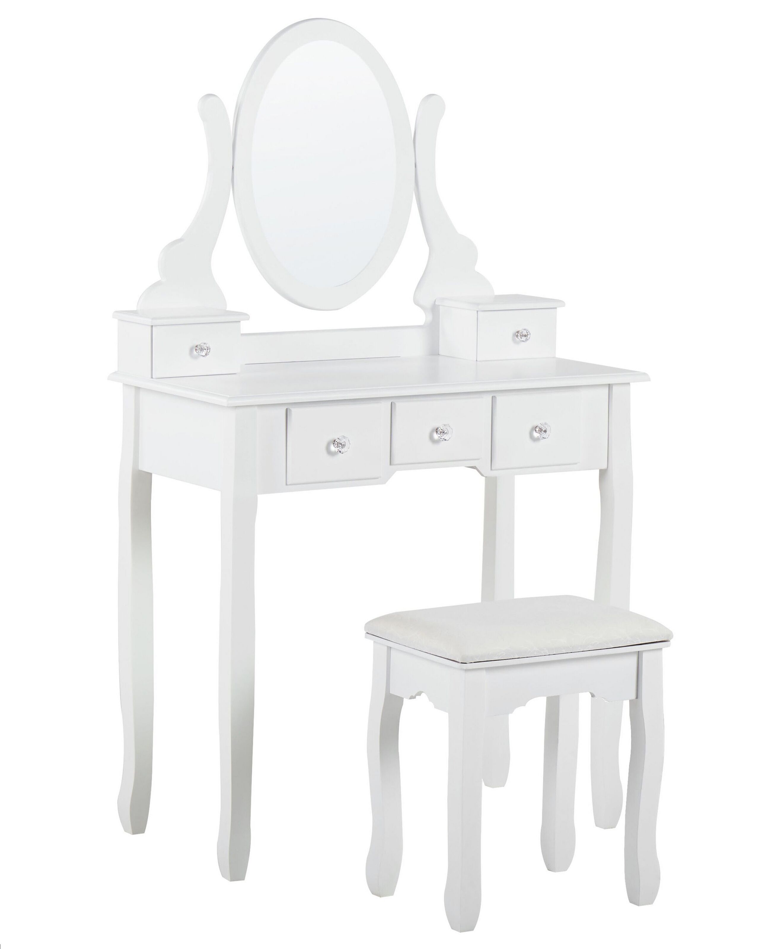Make your daily skin-care or makeup routine easier with this stylish yet functional dressing table. The piece comes with an oval mirror that can be adjusted at a proper angle and an upholstered stool. What is more, thanks to 5 capacious drawers you can keep all the beauty products at hand. The ornamental shape of legs made of solid wood in combination with decorative handles add a glamorous touch to the furniture, making it a perfect addition to any living room or bedroom.
