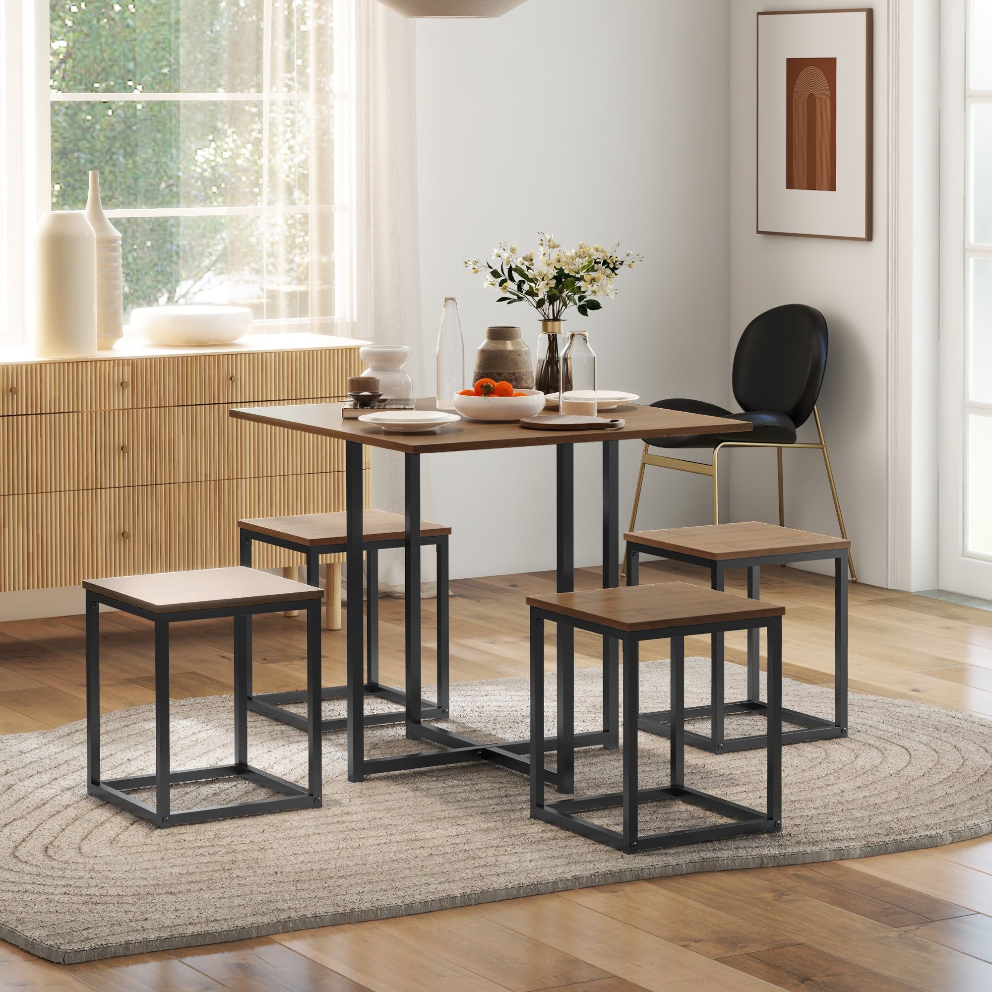 5 PCS Industrial Table & Stool Set w/ Metal Frame Home Dining Stylish Square Compact Seating Chair Beautiful Cool Black Brown
