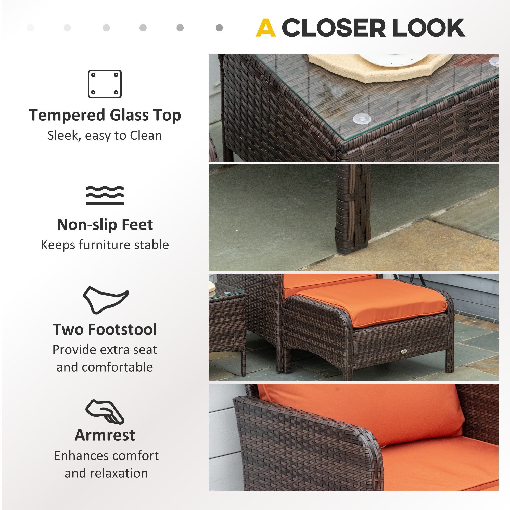 - TEMPERED GLASS TABLETOP: The small garden furniture creates a sleek look which can be wiped clean easily for easy maintenance. DIMENSIONS: Chair: 75H x 71L x 67Wcm. Footstool: 40H x 67L x 51Wcm. Table: 42H x 46L x 46Wcm.
