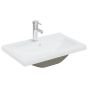 Basin: Colour: White, Material: Ceramic, Overall dimensions: 61 x 39 x 18 cm (L x W x H), Ceramic edge thickness: 4 cm, Drain hole diameter: 4.5 cm, With an overflow, With faucet, Push drainer with overflow function, Assembly required: Yes