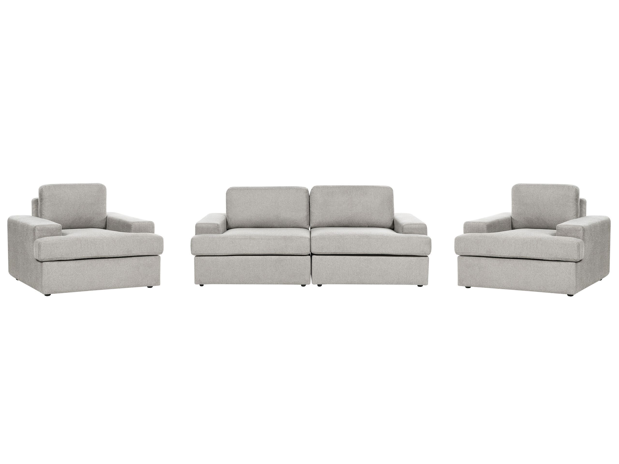 Furnish your living room with this sofa set consisting of a 3-seater sofa and 2 armchairs of a classic design that will perfectly complement living rooms in various styles. Upholstered in durable polyester, with a wooden stable frame construction, the piece is designed to last many years in good condition. The thickly padded seat and back make it a comfortable and stylish piece of furniture. Combine it with a wooden coffee table and transform your living room into a perfect spot to unwind and relax. Details: Color: Grey. Main material: Polyester. Additional material: Plywood, Foam, Eucalyptus Wood, Synthetic Material. Material Composition: 100% Polyester Weight: 133 Capacity: 5 People Assembly: Partial Assembly Required Wood type: Eucalyptus grandis Wood Origin: China Overall Dimensions: 208x112x86 Legs Height: 3 Padding Thickness: 19 3 Seater Sofa Dimensions: 208x112x86 Seat Height: 48 Armchair Dimensions: 108x103x85