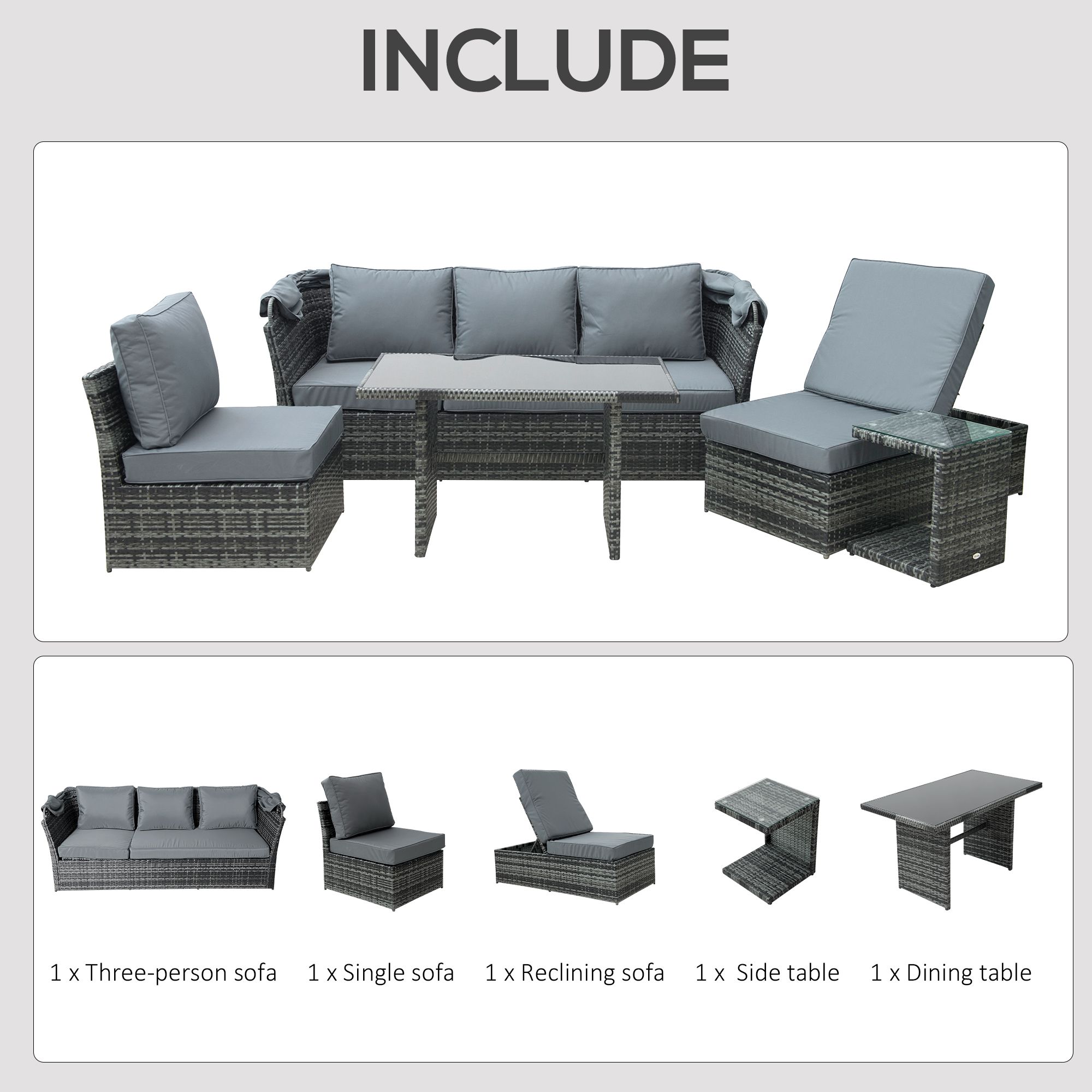 - FIVE-PIECE SET: This 5 piece rattan garden furniture set comes with a three-person sofa, a single sofa, a reclining sofa, a side table, and a dining table, brings stylish and relaxing atmosphere, widely used for outdoor patio, porch, backyard, balcony, poolside, garden, and other suitable space in your home
