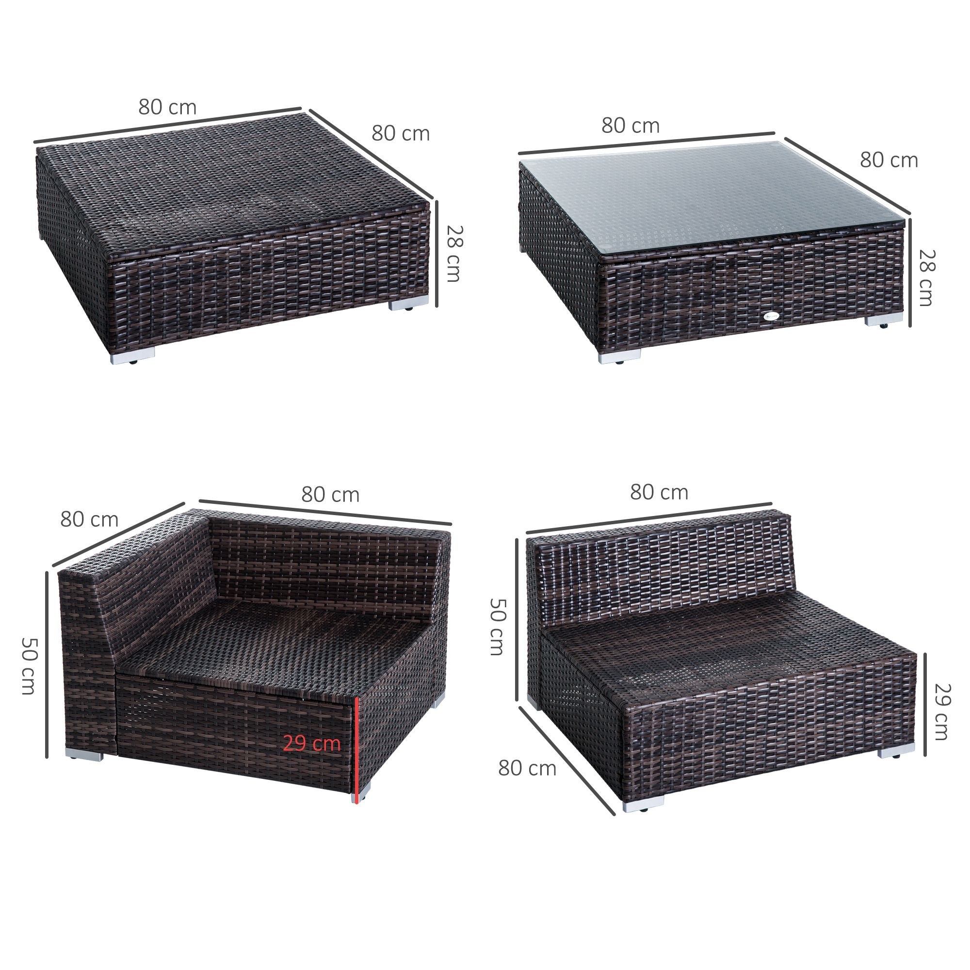 - DIMENSIONS: Corner Sofa Size: 80L x 80W x 50H cm; Middle Sofa Size: 80L x 80W x 50H cm; Footstool Size: 80L x 80W x 28H cm; Coffee Table Size: 80L x 80W x 28H cm