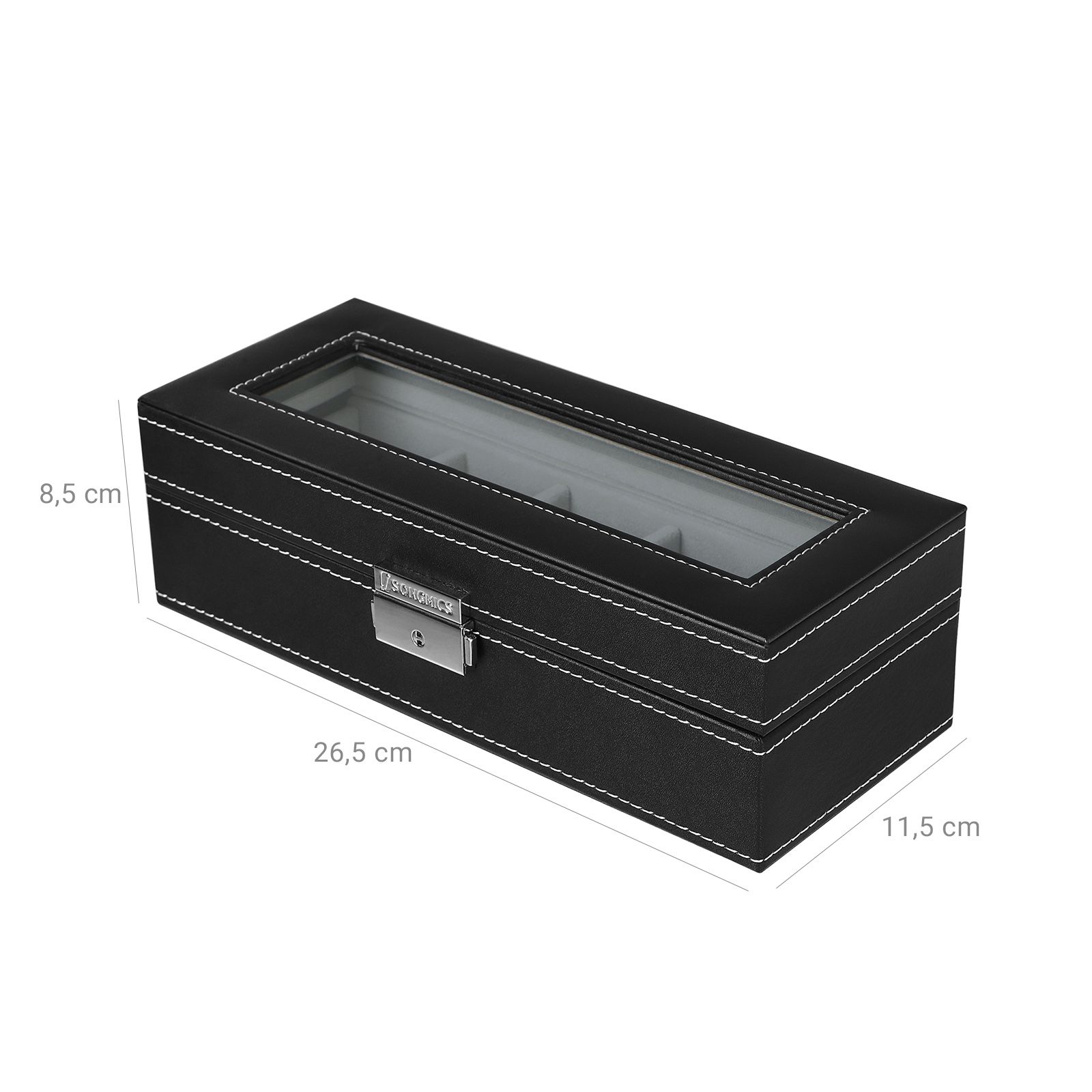 Material: faux leather + suede + MDF- Dimensions: L x W x H: 27.8 x 11.7 x 8.5 cm (10.9" x 4.6" x 3.3")- Grid size: 9 x 4.5 cm- Pillow size: 4.5 x 7.5 x 4 cmShipping List:- 1 x Watch Box (include two keys)