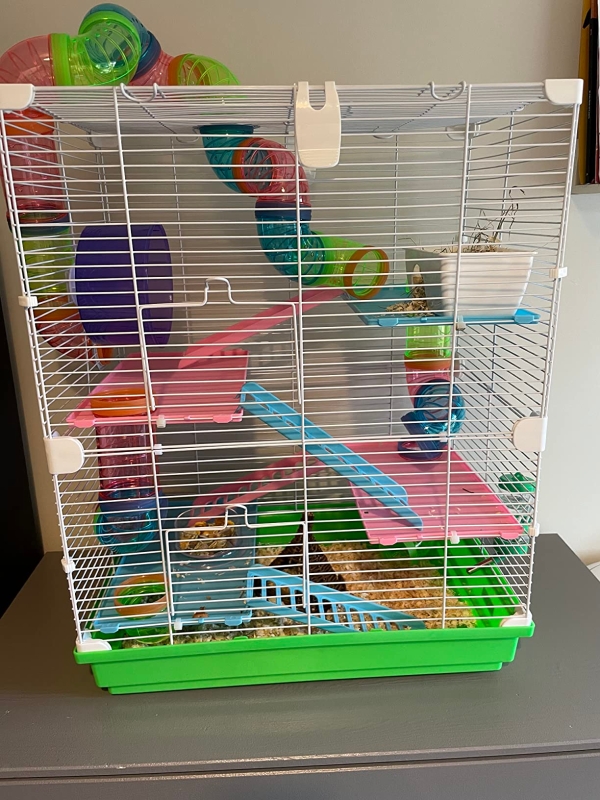 Keep your small pets stimulated, safe and happy with this multi-level small animal cage kit from. The five-tier design gives them room to move around and keep active: it features platforms, a large tunnel which goes inside and outside, an exercise wheel, food dish and water bottle. The play tunnel adds an element of fun. It's finished with a handle to carry easily.