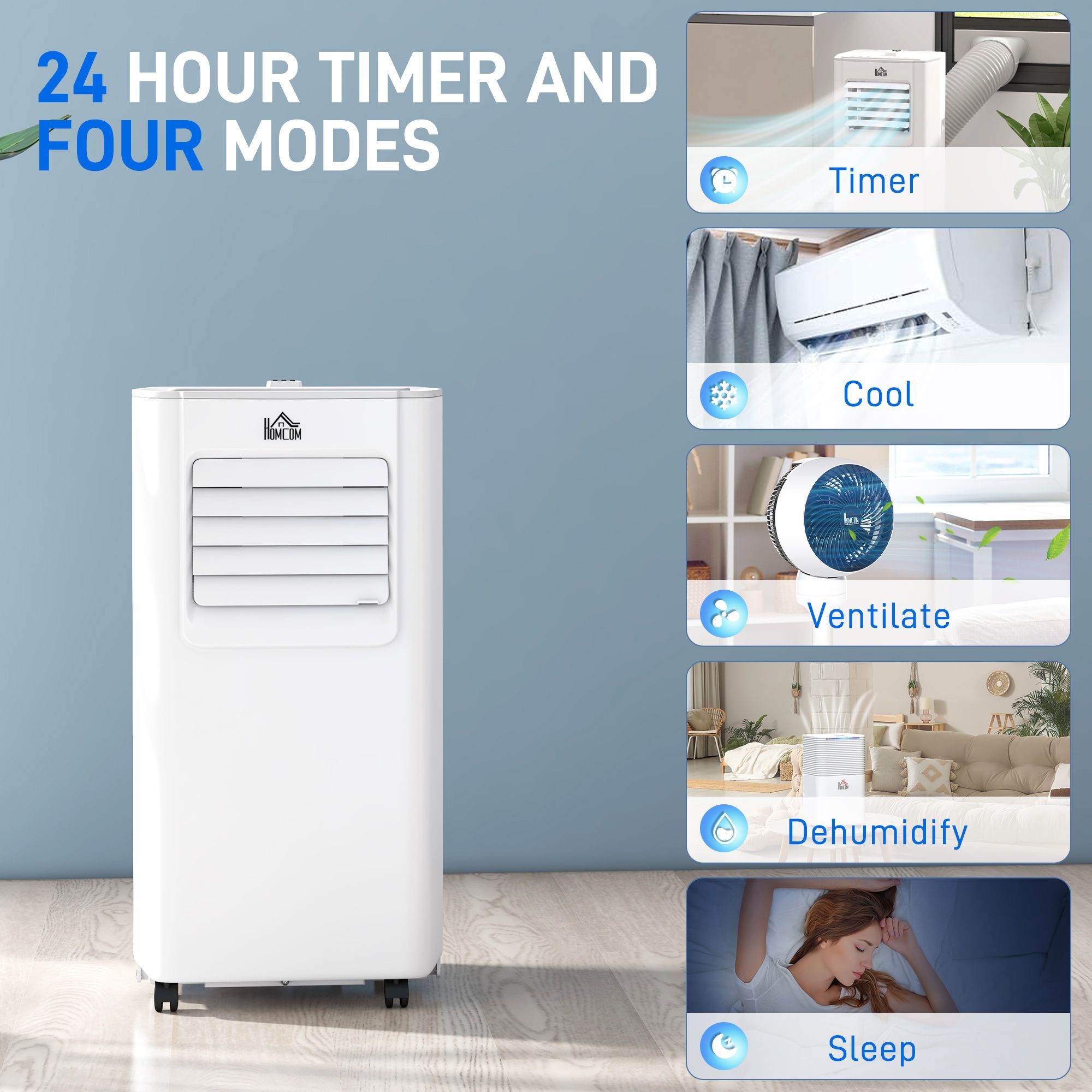 - 4-IN-1 DESIGN: Cool, ventilate, dehumidify and sleep: switches between keeping the area at a specific temperature, blowing the fan around, drying the moisture out of the air and gently increasing the temperature every hour. The portable aircon unit is suitable for use all day long and in different climates