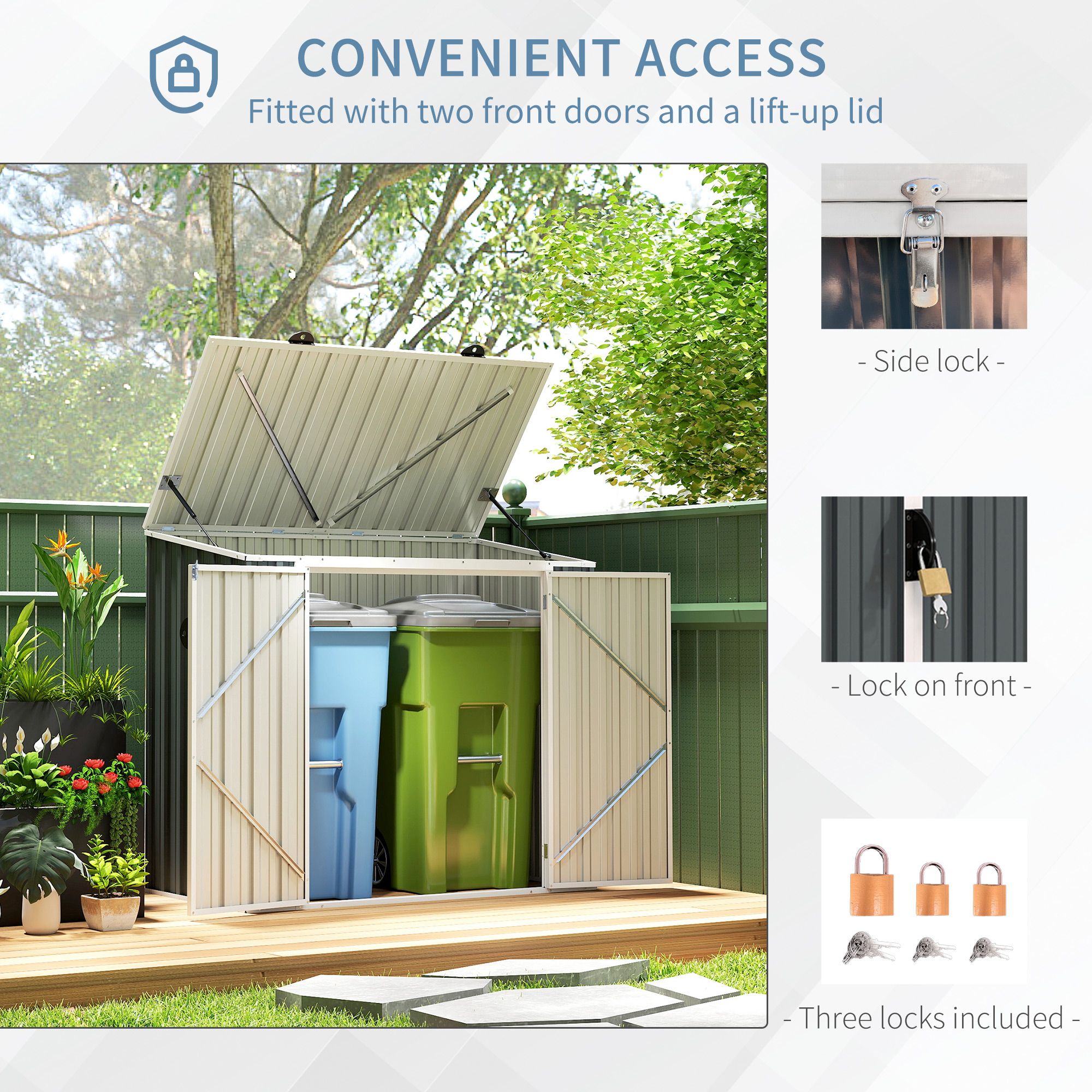 - Suitable for keeping two standard-sized wheelie bins inside