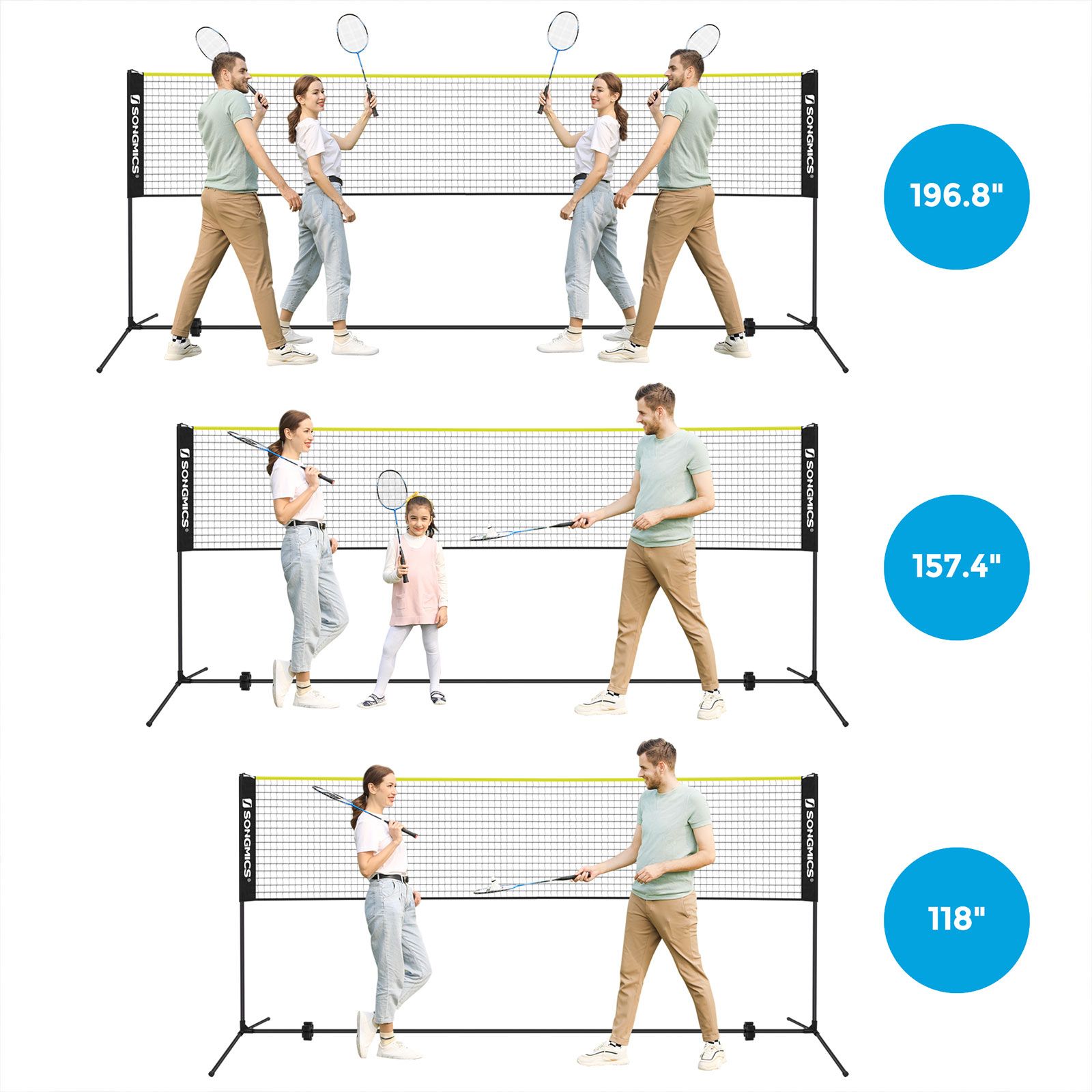 It's sunny and green outside and finally time to get your family back into some nature activities in the backyard! This spring, we have the perfect solution you've been looking for: badminton. With no electronic gadgets or other distractions, your kids will turn to the great outdoors and spend hours with the badminton net. You will be their No. 1 playmate this week!Check the Highlights of Badminton Net:- Height-adjustable net at 107 cm, 120 cm and 155 cm with scale marks.- Supports several over-the-net sports: badminton, tennis, volleyball, etc.- Easy to set up and take down in minutes.- Includes 4 bonus ground pegs for added stability.- The 4-way nylon connectors at the base use the same materials as that of the car bumper for high resilience and durability.- Includes a pack-away bag to carry it anywhere.The set includes a badminton net and posts all in one, so you can set up a badminton court in the backyard, park, beach or gym. Now it's time for sweating with the flying shuttlecock to develop your love for the game!