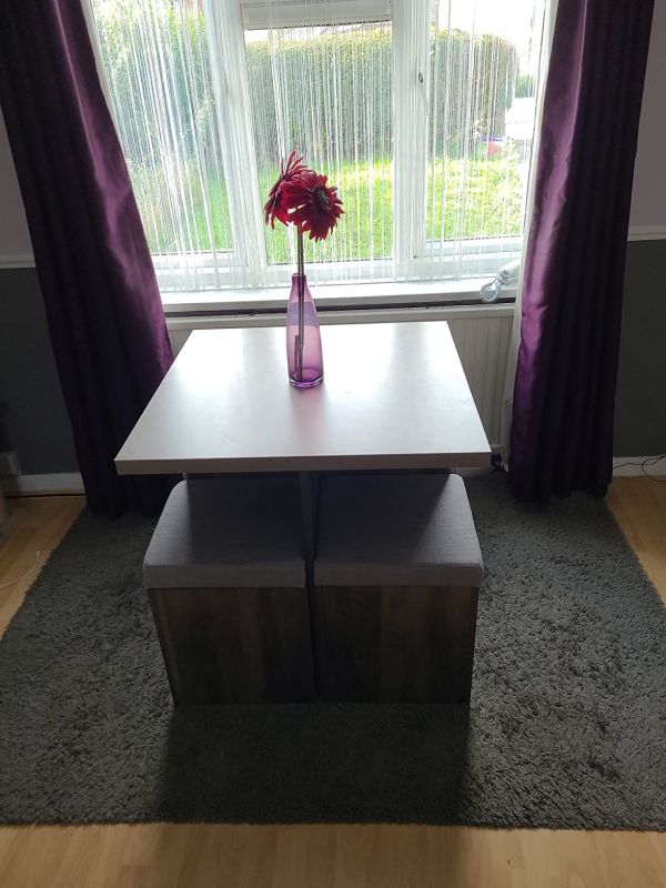 The simple and contemporary 5-piece dining set from is an elegant space-saving dining set ideal for small houses and apartment. The ottoman-style chairs open to reveal convenient storage for magazines and other accessories. Tuck the chairs directly beneath the table of this space-saving dining set to free up floor space when they are not in the use. Wood grain design is stylish and complements to any dining Décor.