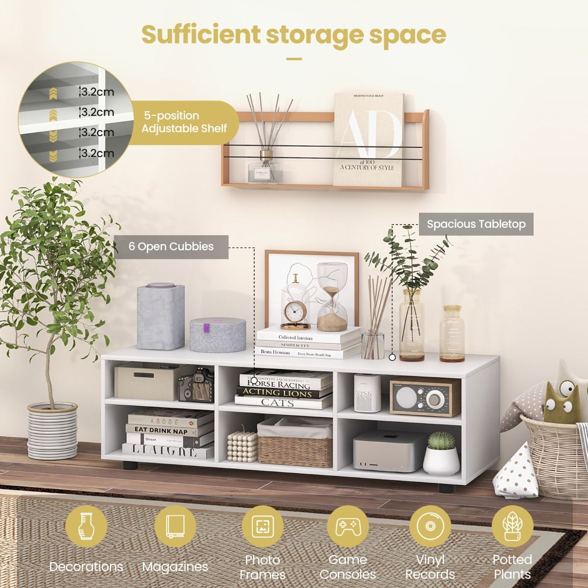 6-Cubby TV Stand TV Console Table with Adjustable Shelves-White