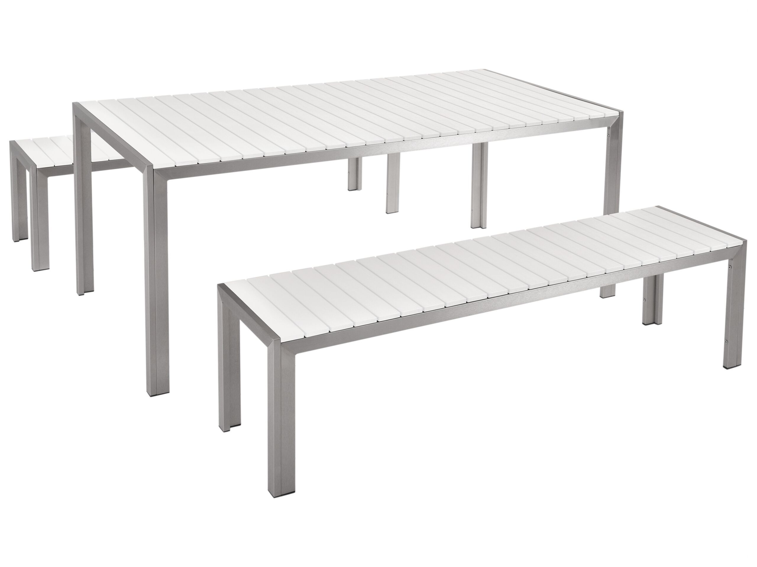 This modern outdoor dining set makes your garden or patio more elegant and stylish. Made of sturdy materials, including an aluminium frame, the set provides resistance against diverse weather conditions. Wide seats ensure enough space for all your guests and family. The dining set looks best when paired with any contemporary or modern garden accessories. Details: Color: White, Silver. Main material: Plastic Wood. Additional material: Aluminium. Weight: 55 Capacity: 4 - 6 People Assembly: Partial Assembly Required Overall Dimensions: 180x90x75 Table Dimensions: 180x90x75 Bench Dimensions: 165x40x45 Seat Height: 45