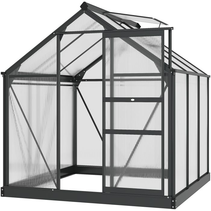 Start and continue the season right with this 6ft x 6ft greenhouse. An open, walk-in design means it's easy to enter and leave, whilst giving you the full free space to set it up how you want. A powder-coated aluminium frame means a strong structure, with four ground stakes included to pin to the ground. Features a sliding door for easy access in and out, with a lift-up roof which holds in place - it's easy to let in fresh air, whenever you want.